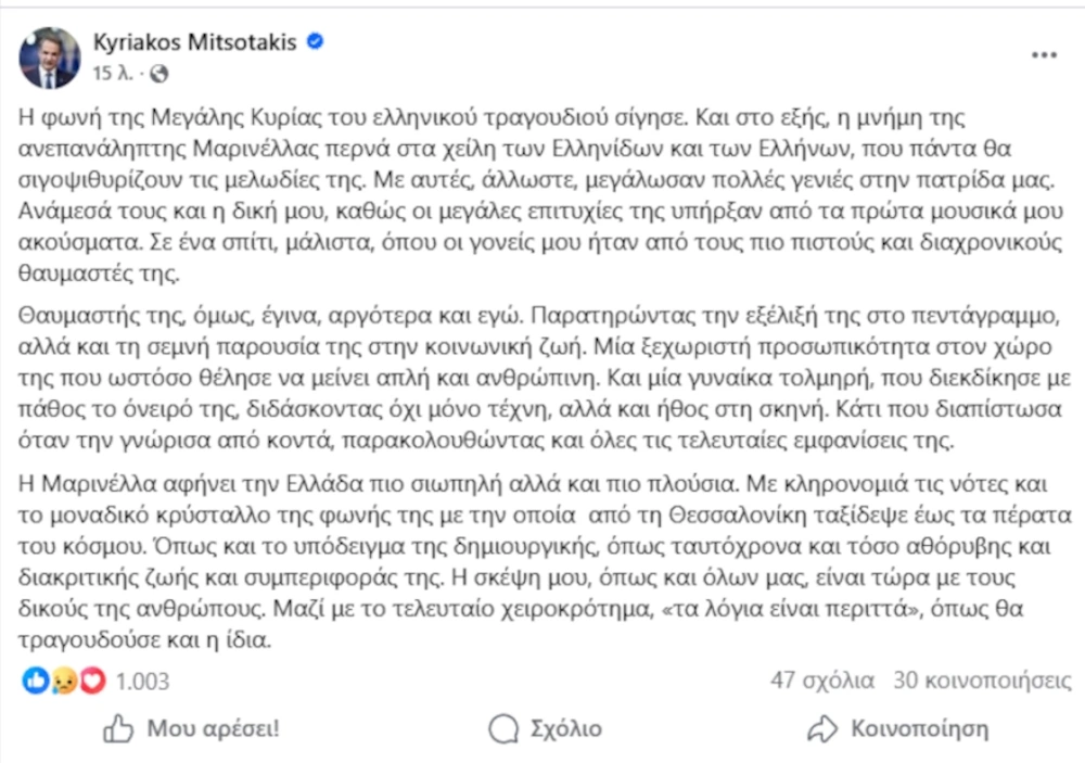 Ο Κυριάκος Μητσοτάκης ξεκίνησε την ανάρτησή του για την Μαρινέλλα, σημειώνοντας: «Η φωνή της Μεγάλης Κυρίας του ελληνικού τραγουδιού σίγησε. Και στο εξής, η μνήμη της ανεπανάληπτης Μαρινέλλας περνά στα χείλη των Ελληνίδων και των Ελλήνων, που πάντα θα σιγοψιθυρίζουν τις μελωδίες της».