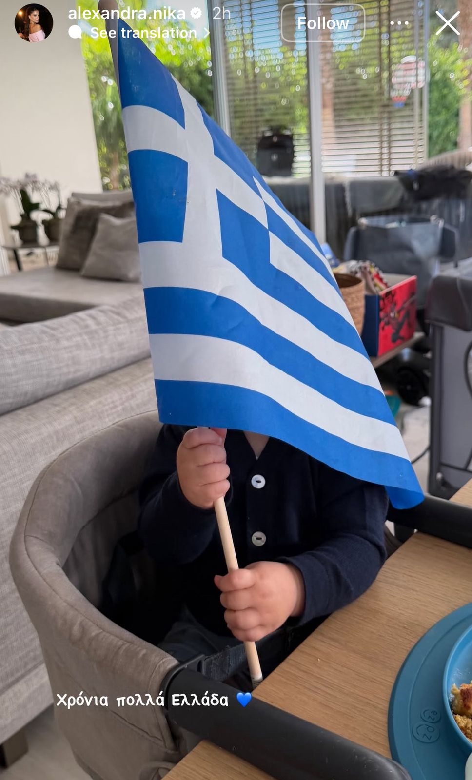 Με αφορμή την εθνική επέτειο της 28ης Οκτωβρίου, η όμορφη μαμά δημοσίευσε μία ακόμη συγκινητική φωτογραφία σε story, στην οποία ο μικρός Βασίλης –όπως βαφτίστηκε πριν από λίγους μήνες– κρατούσε περήφανα την ελληνική σημαία στα χέρια του.