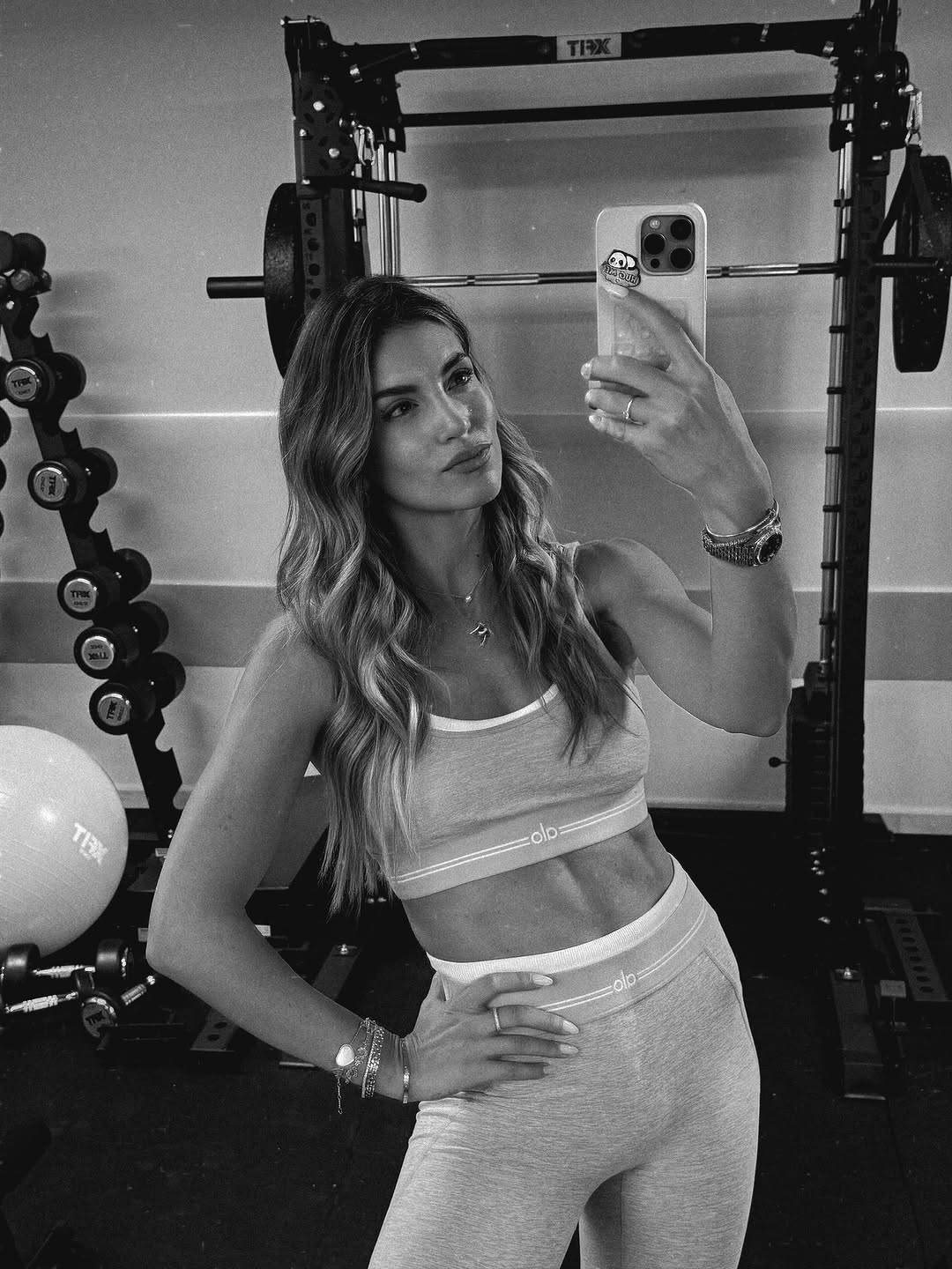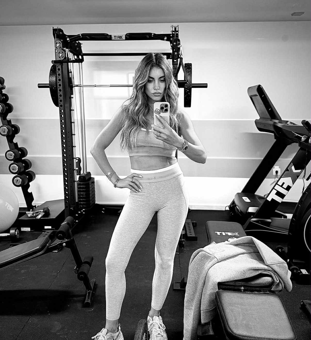 Η ηθοποιός, φορώντας ένα γκρι σετ αθλητικών ρούχων, αποτελούμενο από crop top και ψηλόμεσο κολάν, πόζαρε μπροστά στον καθρέφτη του γυμναστηρίου, τη στιγμή που κρατά βαράκια.
