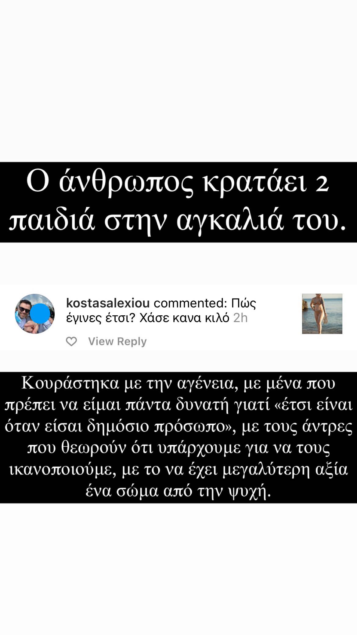 Η συγκεκριμένη φωτογραφία δέχτηκε ανάμεσα σε άλλα και κάποια -ευτυχώς λίγα- επικριτικά σχόλια για το σώμα της. Η Δανάη αποφάσισε να μοιραστεί κάποια από αυτά στα Insta Stories της θέλοντας να υπερασπιστεί το δικαίωμά της να μπορεί να φοράει ό,τι θέλει και να είναι όπως θέλει.