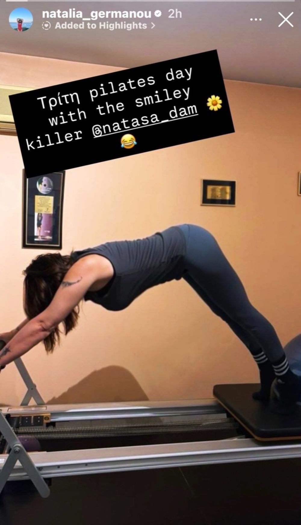 Πάνω στο στιγμιότυπο που δημοσίευσε ανέφερε χαρακτηριστικά: «Τρίτη pilates day with the smiley killer», δείχνοντας πως το pilates αποτελεί σταθερή επιλογή στη ρουτίνα της.