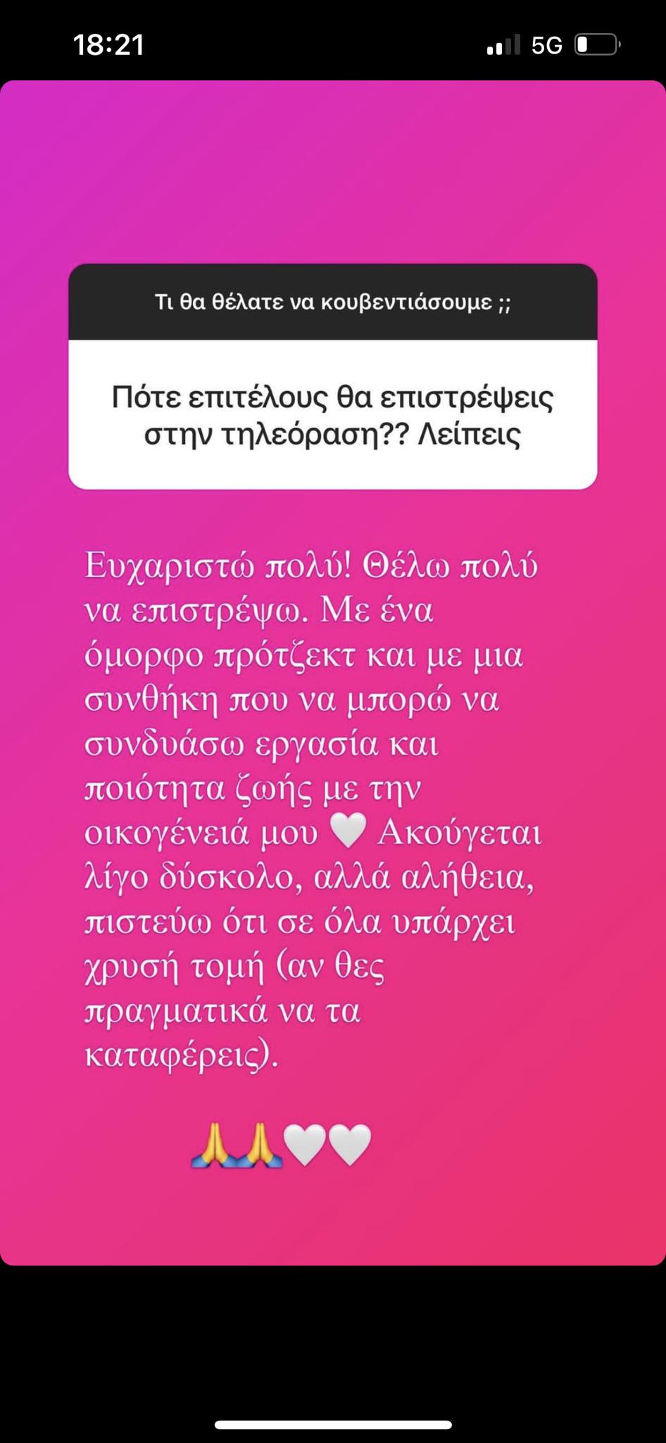 Εκτός όμως από τα θέματα που αφορούν την εγκυμοσύνη, ιδιαίτερο ήταν το ενδιαφέρον του κοινού και για την τηλεοπτική της επιστροφή με την ίδια να αφήνει όλα τα σενάρια ανοιχτά.