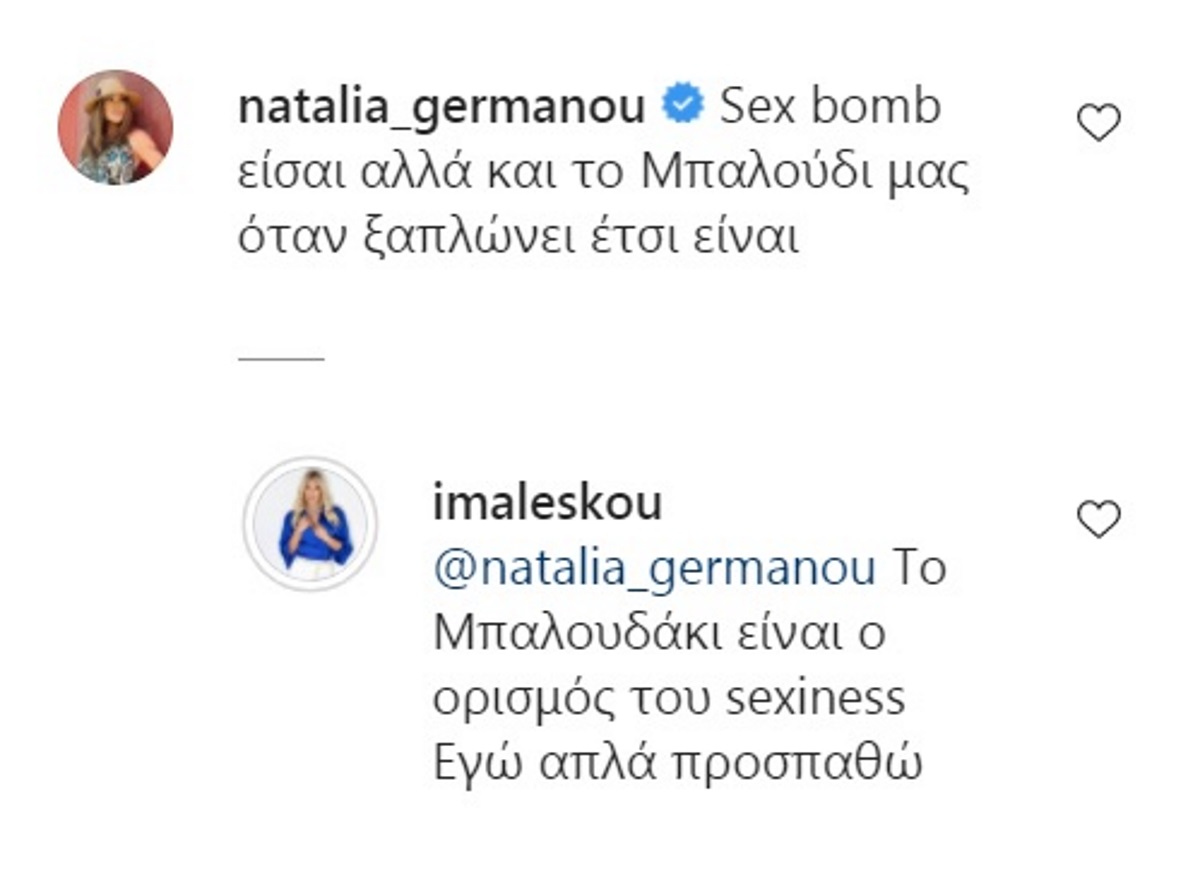 Μεταξύ άλλων, εντοπίσαμε κι αυτό της Ναταλίας Γερμανού, η οποία της έγραψε χαρακτηριστικά: «Sex bomb είσαι, αλλά και το Μπαλούδι μας όταν ξαπλώνει έτσι είναι», με την Ιωάννα Μαλέσκου να της απαντά: «Το Μπαλουδάκι είναι ο ορισμός του sexiness. Εγώ απλά προσπαθώ».