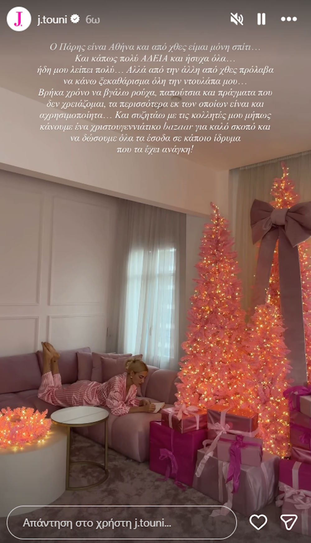 «Ο Πάρης είναι Αθήνα και από χθες είμαι μόνη σπίτι. Και κάπως πολύ άδεια και ήσυχα όλα. Ήδη μου λείπει πολύ… Αλλά από την άλλη από χθες πρόλαβα να κάνω ξεκαθάρισμα όλη την ντουλάπα μου. Βρήκα χρόνο να βγάλω ρούχα, παπούτσια και πράγματα που δεν χρειάζομαι, τα περισσότερα εκ των οποίων είναι και αχρησιμοποίητα… Και συζητάω με τις κολλητές μου μήπως κάνουμε ένα χριστουγεννιάτικο bazaar για καλό σκοπό και να δώσουμε όλα τα έσοδα σε κάποιο ίδρυμα που τα έχει ανάγκη».