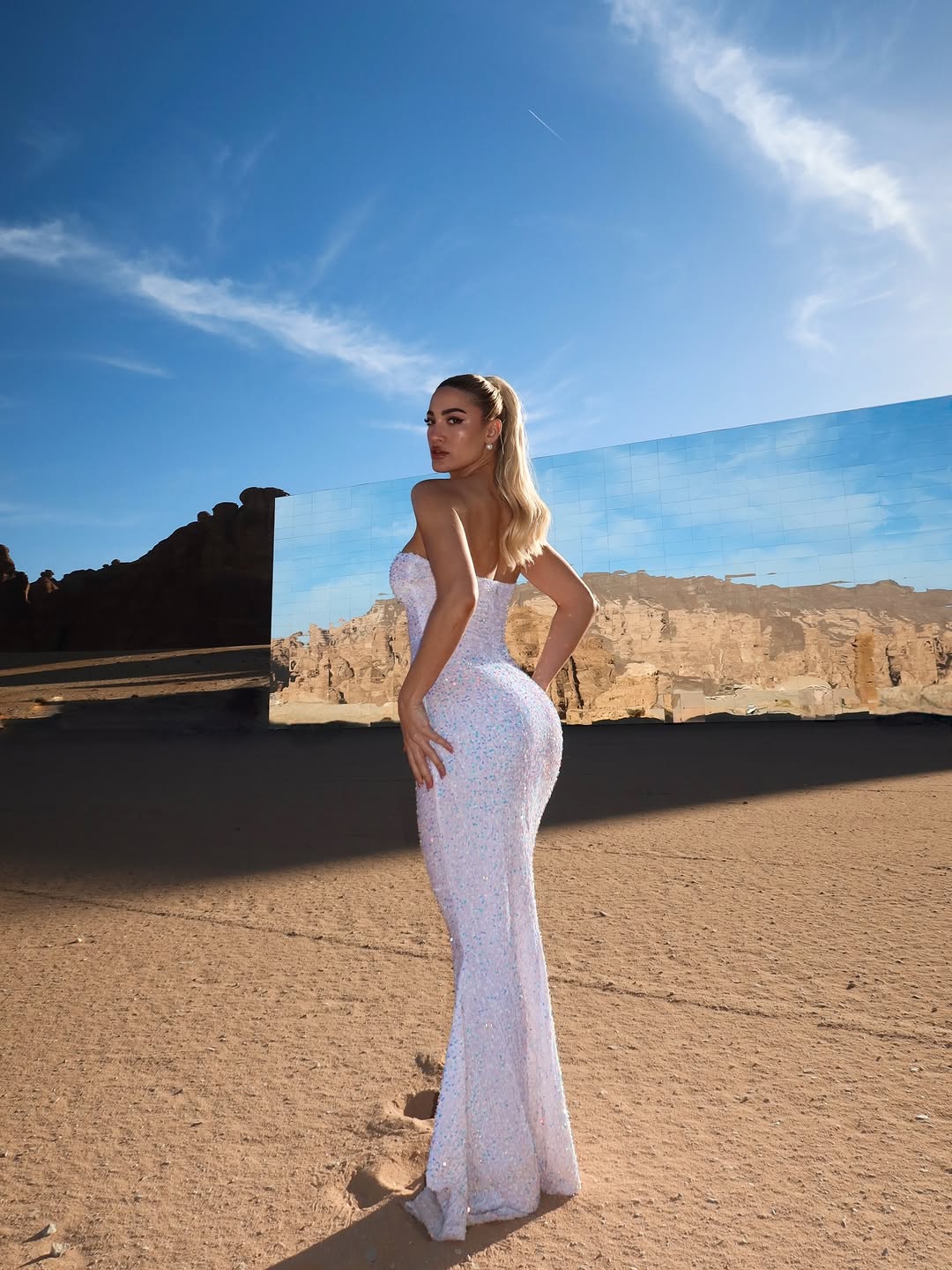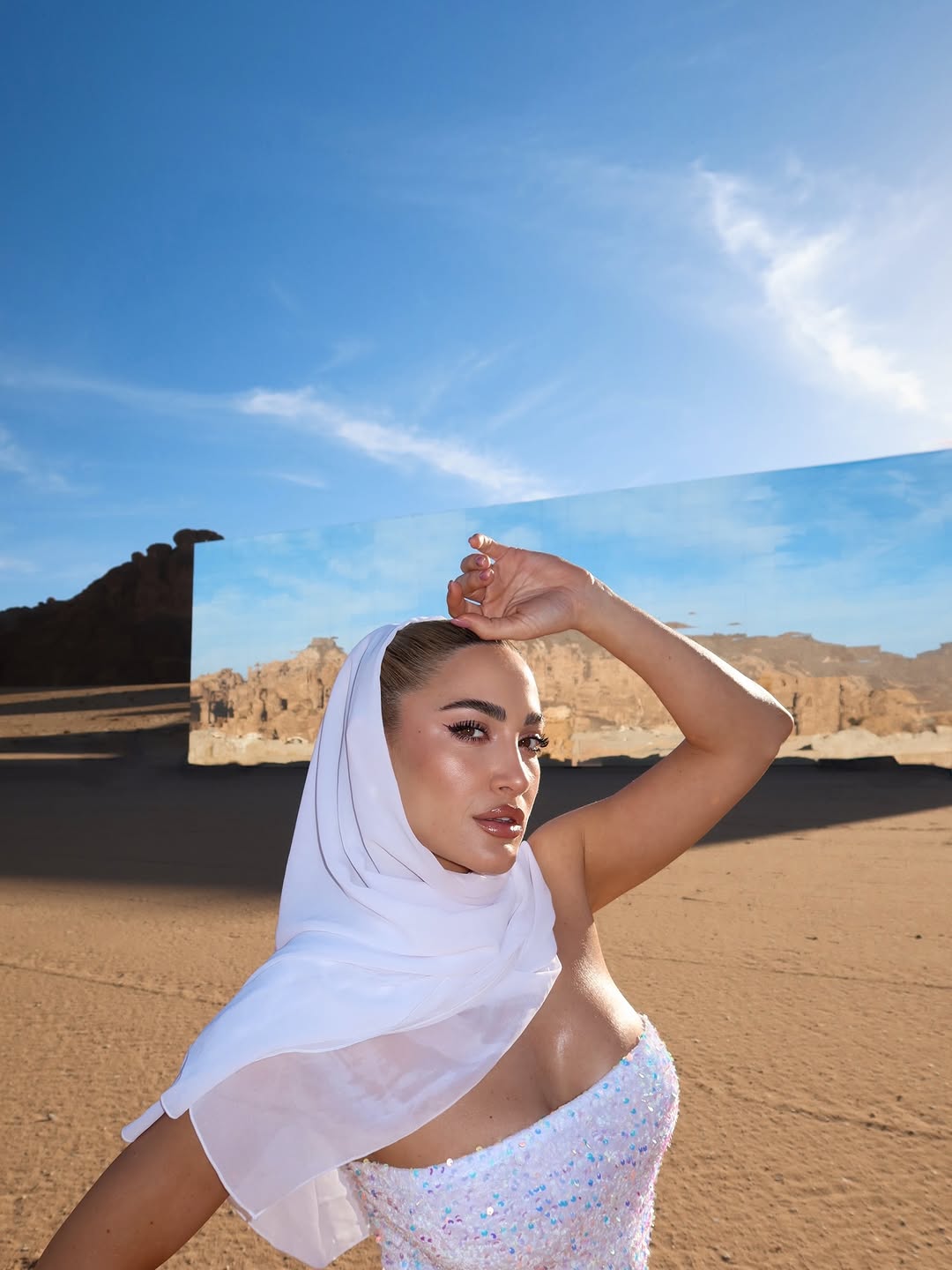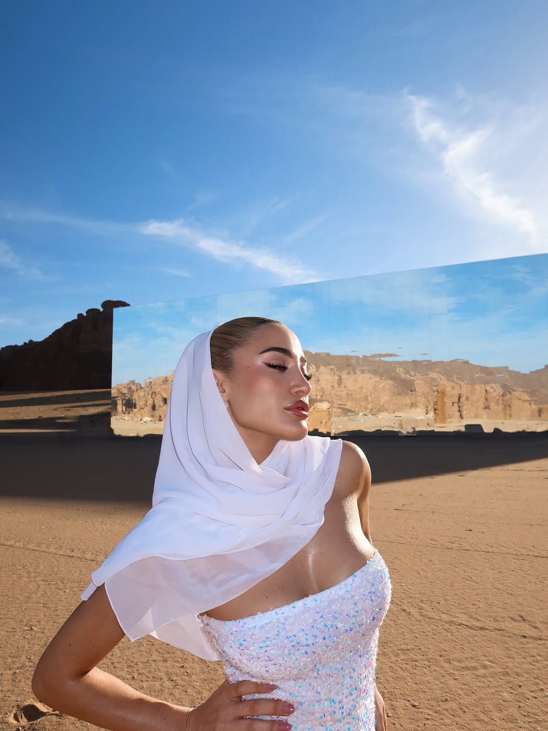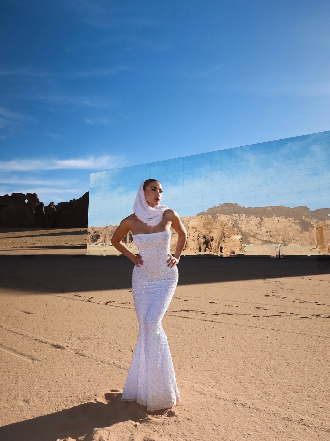 Στα στιγμιότυπα που μοιράστηκε, η επιχειρηματίας και influencer ποζάρει φορώντας ένα μακρύ, εφαρμοστό φόρεμα με λάμψεις σε ανοιχτή απόχρωση, το οποίο συνδύασε με λευκό μαντήλι στο κεφάλι. Στις εικόνες τη βλέπουμε να ποζάρει μπροστά σε έναν μεγάλο καθρεφτισμένο τοίχο, με φόντο το φυσικό τοπίο και τον ουρανό.