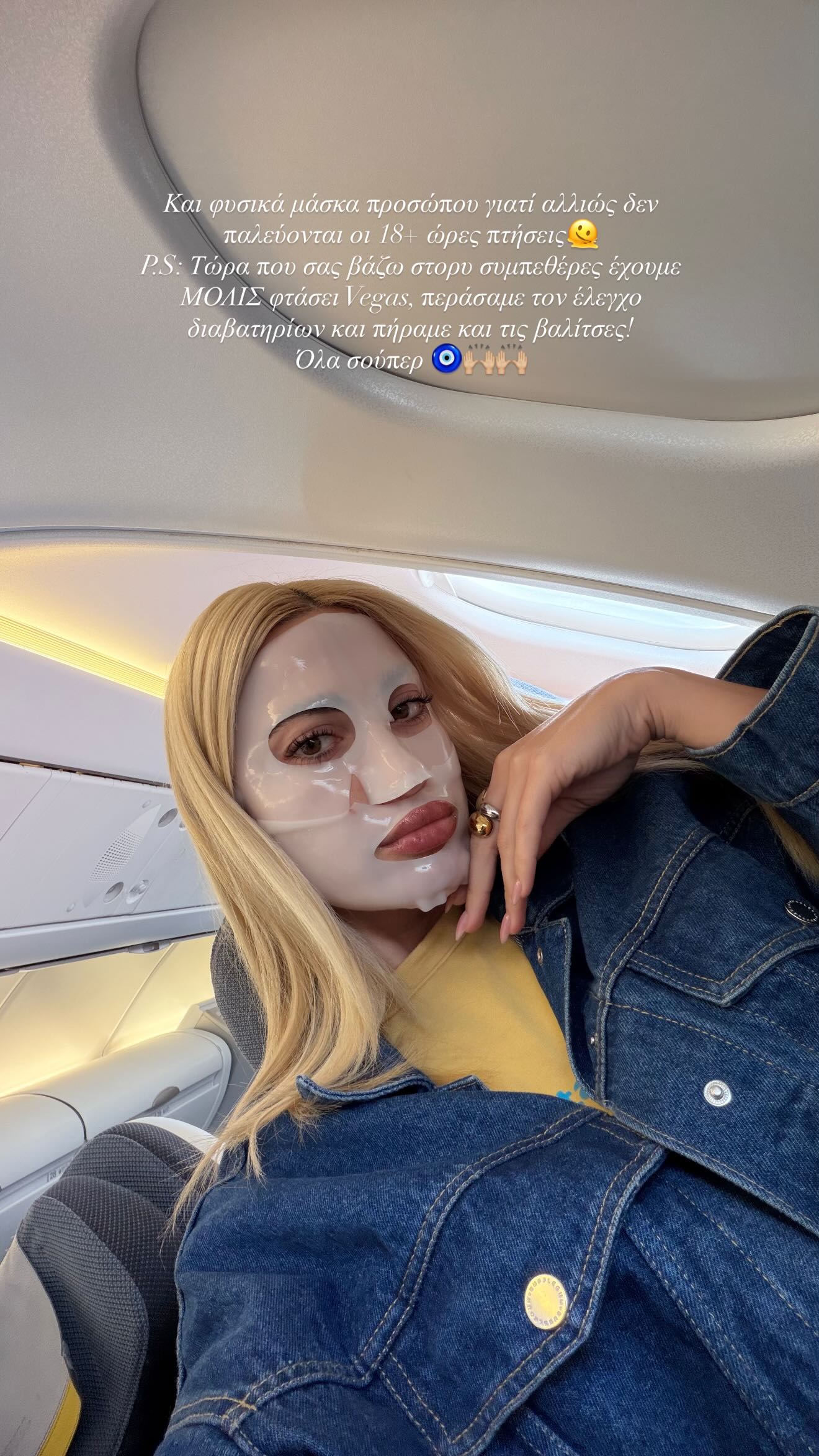 Η γνωστή influencer δημοσίευσε story στον προσωπικό της λογαριασμό στο Instagram, όπου φαίνεται να φοράει μάσκα προσώπου κατά τη διάρκεια της πτήσης.