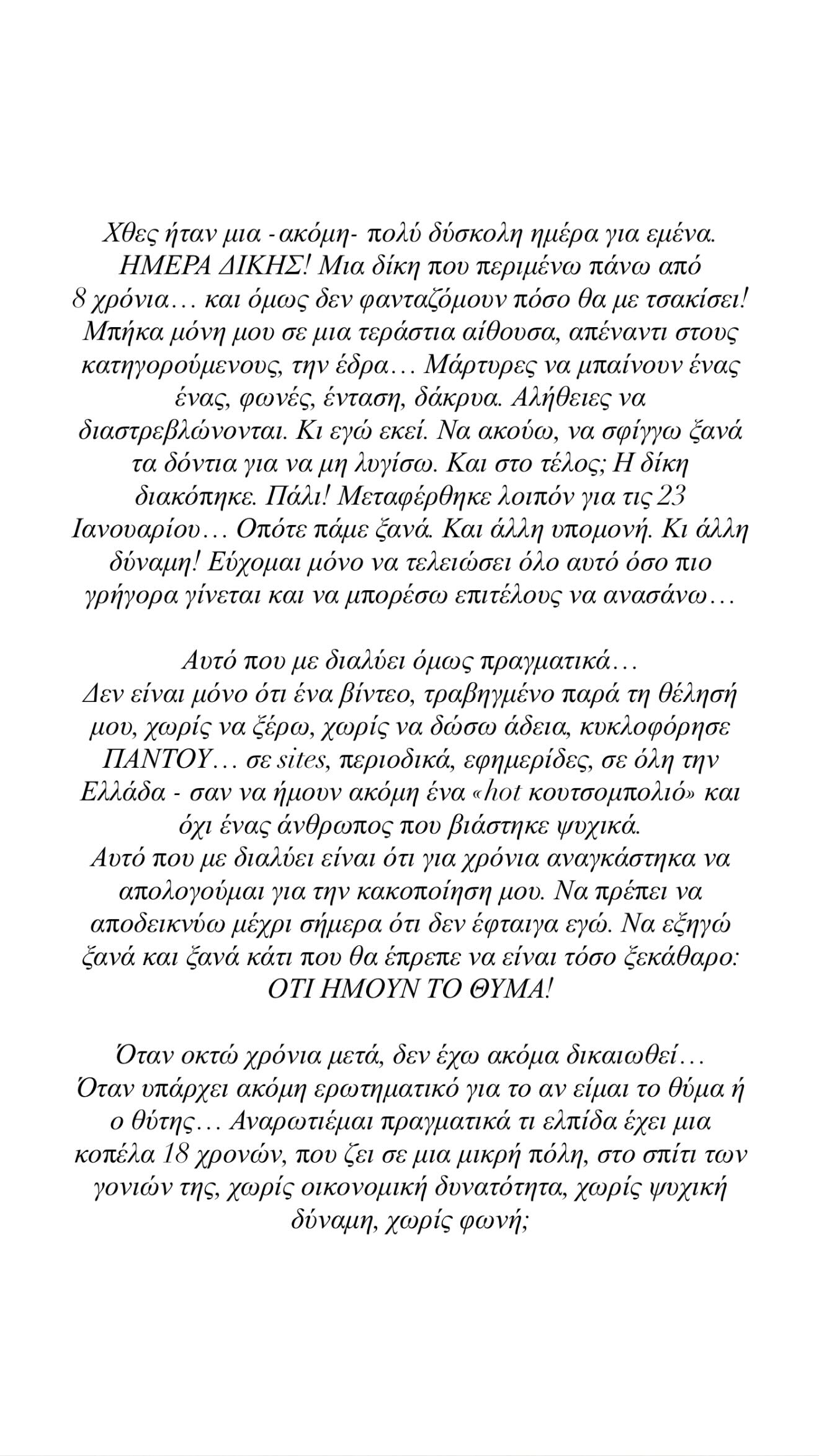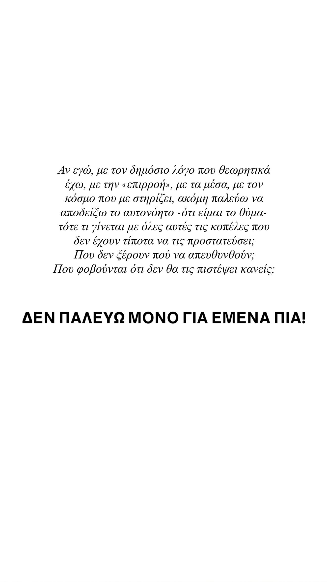 Αν εγώ, με δημόσιο λόγο και στήριξη κόσμου, ακόμη πρέπει να αποδείξω το αυτονόητο, τότε τι ελπίδα έχει μια κοπέλα 18 χρονών, σε μικρή πόλη, χωρίς οικονομική δυνατότητα, χωρίς φωνή; Δεν παλεύω πια μόνο για μένα. Παλεύω για κάθε γυναίκα που δεν έχει τίποτα να την προστατεύσει. Για την αξιοπρέπεια και την αλήθεια που δεν πρέπει να αποδεικνύεται ξανά και ξανά. Ελπίζω κάθε άνθρωπος που νομίζει ότι έχει δικαίωμα να παραβιάσει και να καταστρέψει τη ζωή μιας γυναίκας, να καταλάβει ότι αυτές οι πράξεις δεν είναι λάθη. Είναι βία. ΕΙΝΑΙ ΕΓΚΛΗΜΑ! Και εύχομαι καμία άλλη γυναίκα να μην βιώσει ό,τι έζησα εγώ».