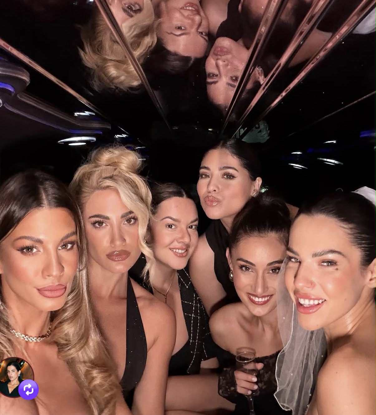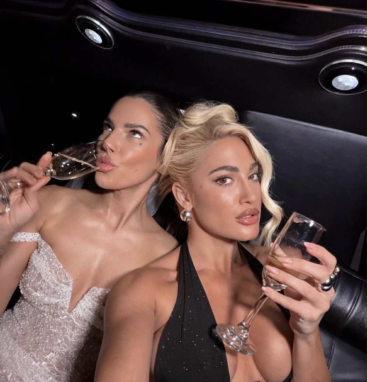 Στις φωτογραφίες, οι δύο φίλες μαζί με την παρέα τους φαίνονται μέσα σε λιμουζίνα να πίνουν σαμπάνια και να γιορτάζουν, με τη νύφη να λάμπει μέσα στο μίνι νυφικό της και το πέπλο. Ωστόσο, όπως αποκάλυψε η ίδια στο τελευταίο slide, η παρέα παρακολούθησε και εντυπωσιακό strip show.