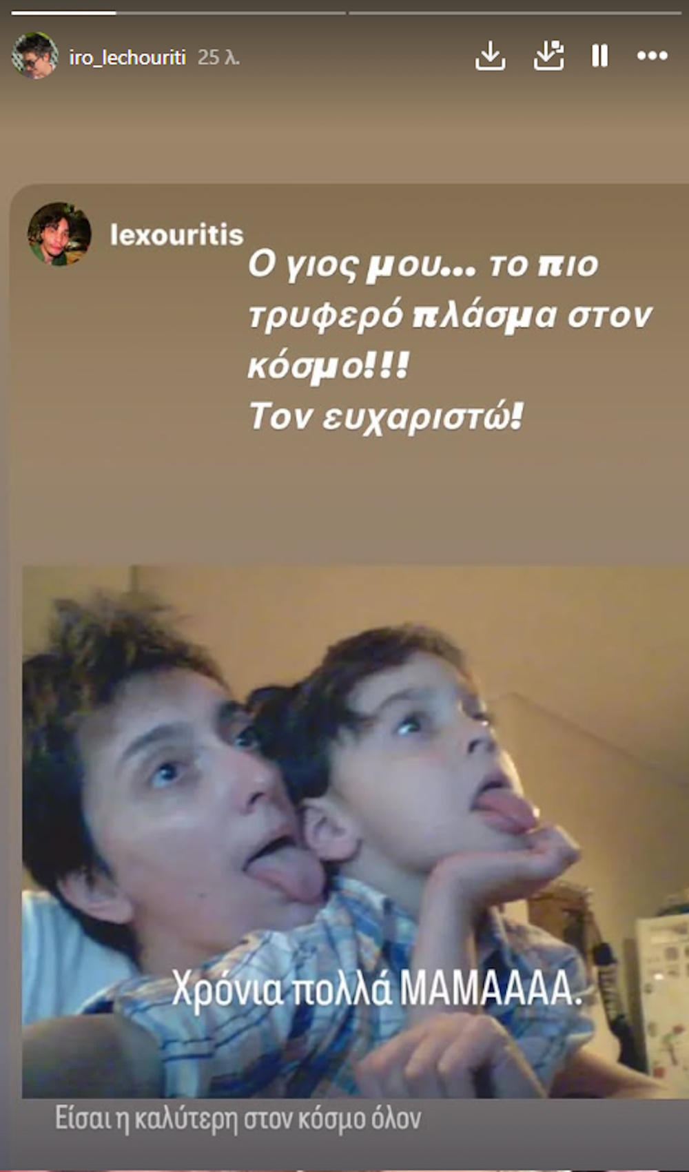 «Χρόνια πολλά μαμά. Είσαι η καλύτερη στον κόσμο όλον», ανέφερε αρχικά στα stories του στο Instagram και συνέχισε: «Σήμερα έχει γενέθλια μια γυναίκα που έχει παίξει τεράστιο ρόλο στη ζωή μου. Εάν υπήρχε βραβείο καλύτερης μητέρας, σίγουρα θα το κέρδιζε σε πρώτη θέση».