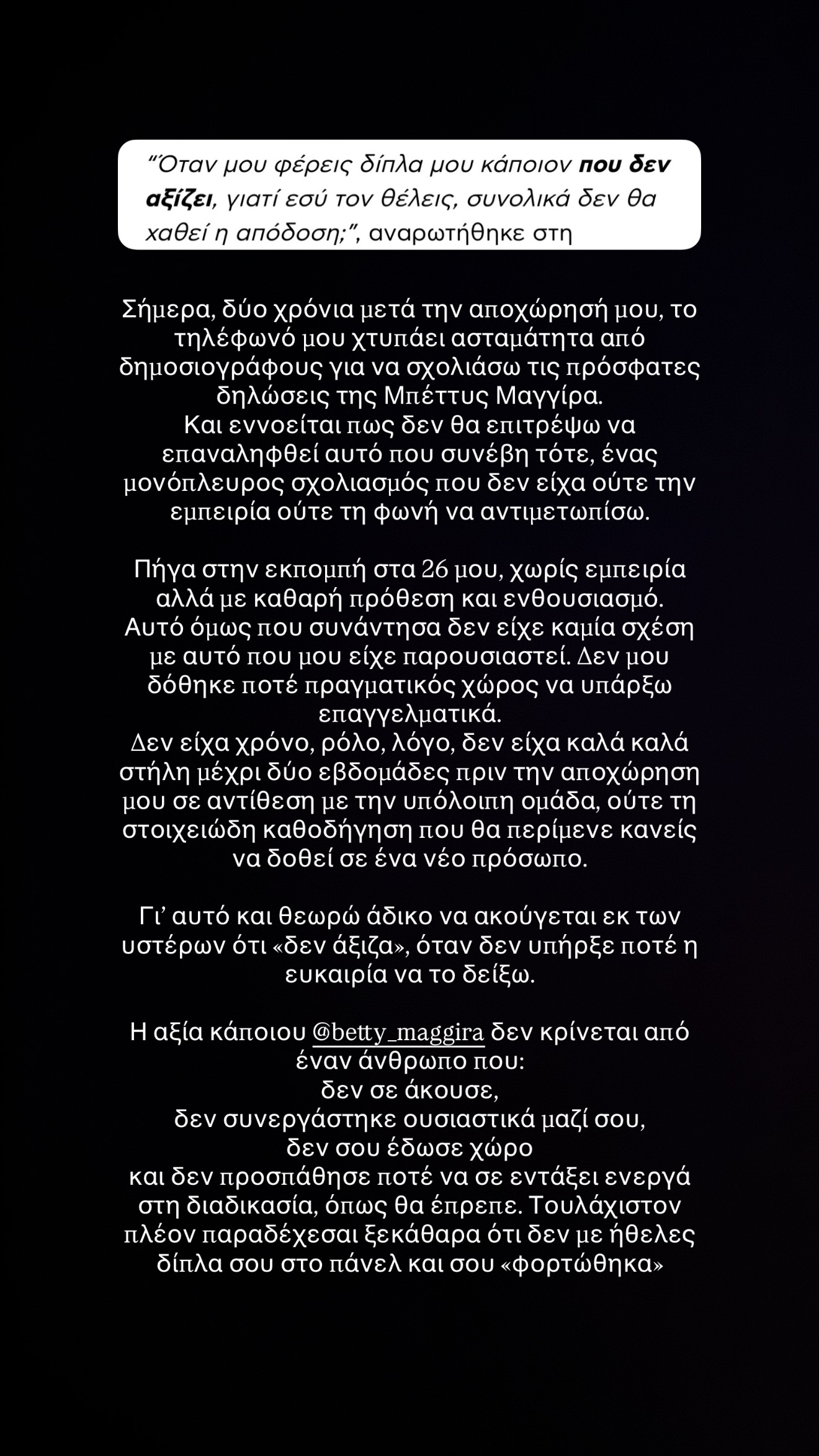 «Η αξία κάποιου, Μπέττυ Μαγγίρα, δεν κρίνεται από έναν άνθρωπο που: δεν σε άκουσε, δεν συνεργάστηκε ουσιαστικά μαζί σου, δεν σου έδωσε χώρο και δεν προσπάθησε ποτέ να σε εντάξει ενεργά στη διαδικασία, όπως θα έπρεπε. Τουλάχιστον πλέον παραδέχεσαι ξεκάθαρα ότι δεν με ήθελες δίπλα σου στο πάνελ και σου «φορτώθηκα»».