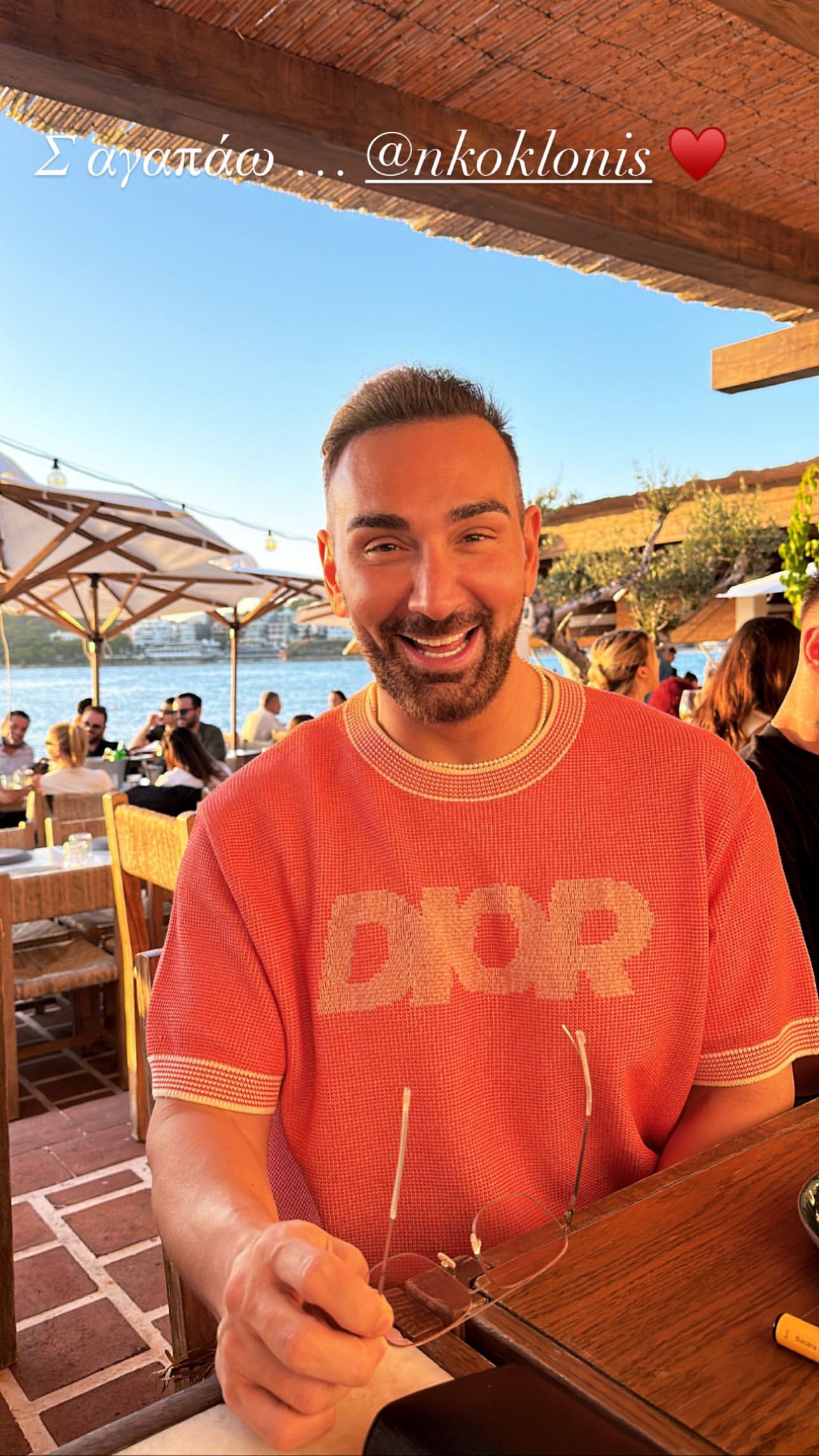 Ο παρουσιαστής ποζάρει στον φακό χαρούμενος με την Κατερίνα Καινούργιου να σημειώνει στο story: «Σε αγαπάω Νίκο Κοκλώνη».