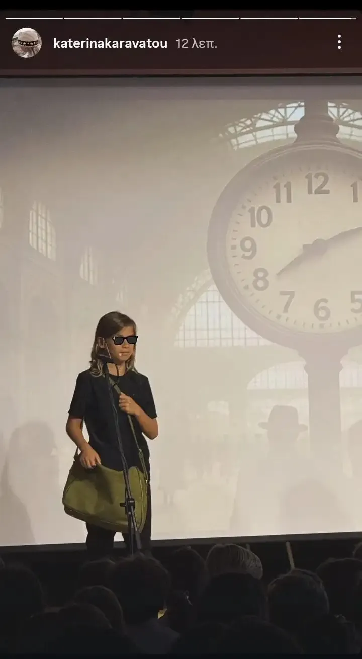 Στα stories της φαίνεται πρώτα η ελληνική σημαία να κυματίζει πάνω από το σχολικό κτίριο. Ακολουθεί πλάνο με τον Αρίωνα να περπατά προς την είσοδο, φορώντας ένα μεγάλο σακίδιο στην πλάτη, Στη συνέχεια, ο μικρός ανεβαίνει στη σκηνή για το ποίημα: στέκεται μπροστά στο μικρόφωνο, με γυαλιά ηλίου και τσάντα περασμένη χιαστί.