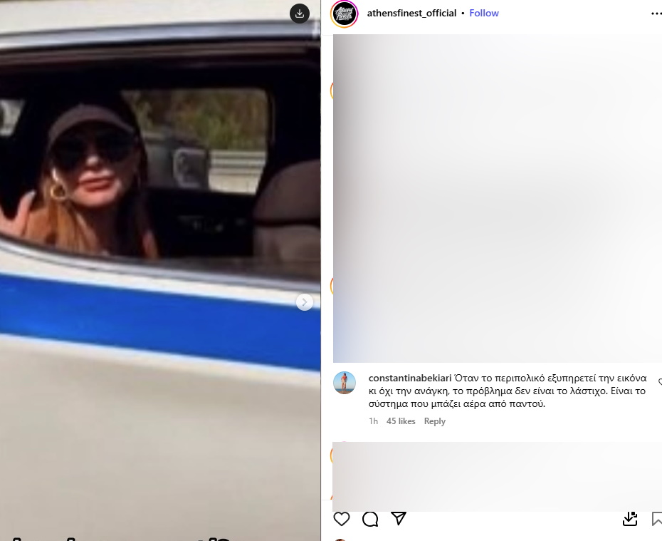 Η πρώην σύζυγος του Βασίλη Μπισμπίκη σχολίασε με νόημα το βίντεο που απεικονίζει την τραγουδίστρια να μεταφέρεται με περιπολικό, γράφοντας χαρακτηριστικά: «Όταν το περιπολικό εξυπηρετεί την εικόνα και όχι την ανάγκη, το πρόβλημα δεν είναι το λάστιχο. Είναι το σύστημα που μπάζει αέρα από παντού». Το επίμαχο σχόλιό της δημοσιεύτηκε κάτω από ανάρτηση γνωστής ιστοσελίδας στο Instagram.