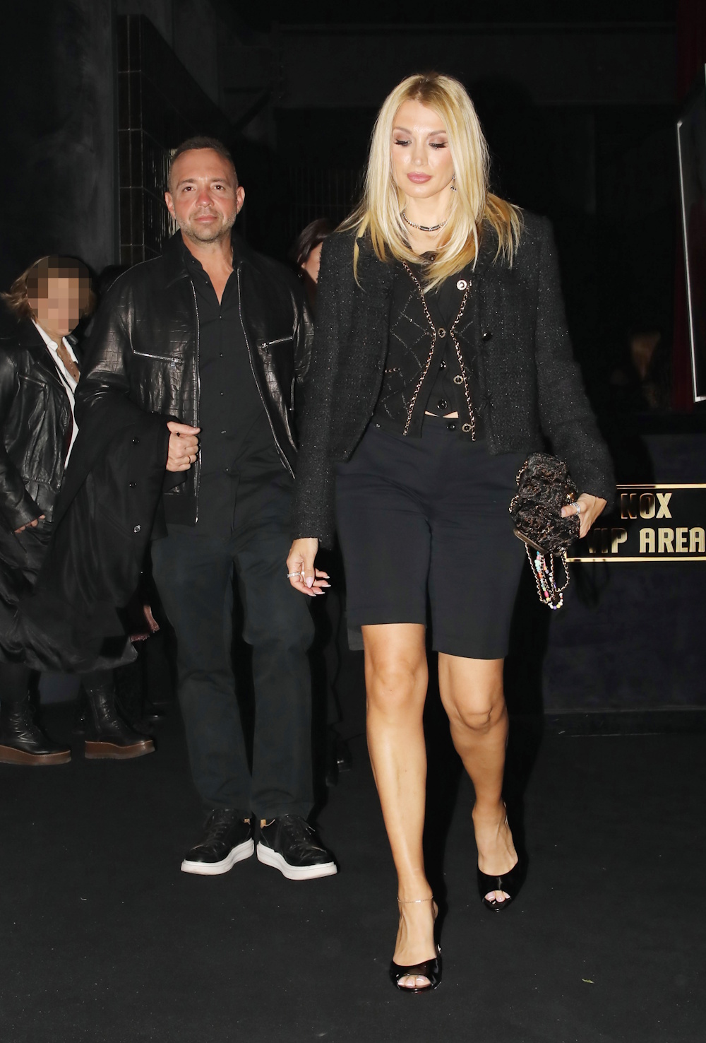 Για τη συγκεκριμένη εμφάνισή της η Κωνσταντίνα επέλεξε ένα total black look, συνδυάζοντας μια μακριά κομψή βερμούδα, με ένα τοπ και από πάνω το σακάκι με λάμψεις.
