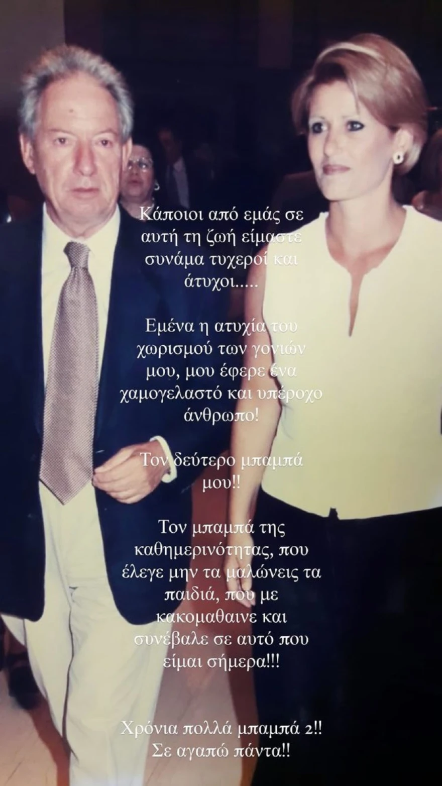 Σε μία φωτογραφία με τον πατριό του και την μητέρα του, έγραψε χαρακτηριστικά: «Κάποιοι από εμάς σε αυτή την ζωή είμαστε συνάμα τυχεροί και άτυχοι… Εμένα η ατυχία του χωρισμού των γονιών μου, μου έφερε ένα χαμογελαστό και υπέροχο άνθρωπο! Τον δεύτερο μπαμπά μου!! Τον μπαμπά της καθημερινότητας, που έλεγε μην τα μαλώνεις τα παιδιά, που με κακομάθαινε και συνέβαλε σε αυτό, που είμαι σήμερα!! Χρόνια πολλά μπαμπά 2! Σε αγαπώ πάντα!».