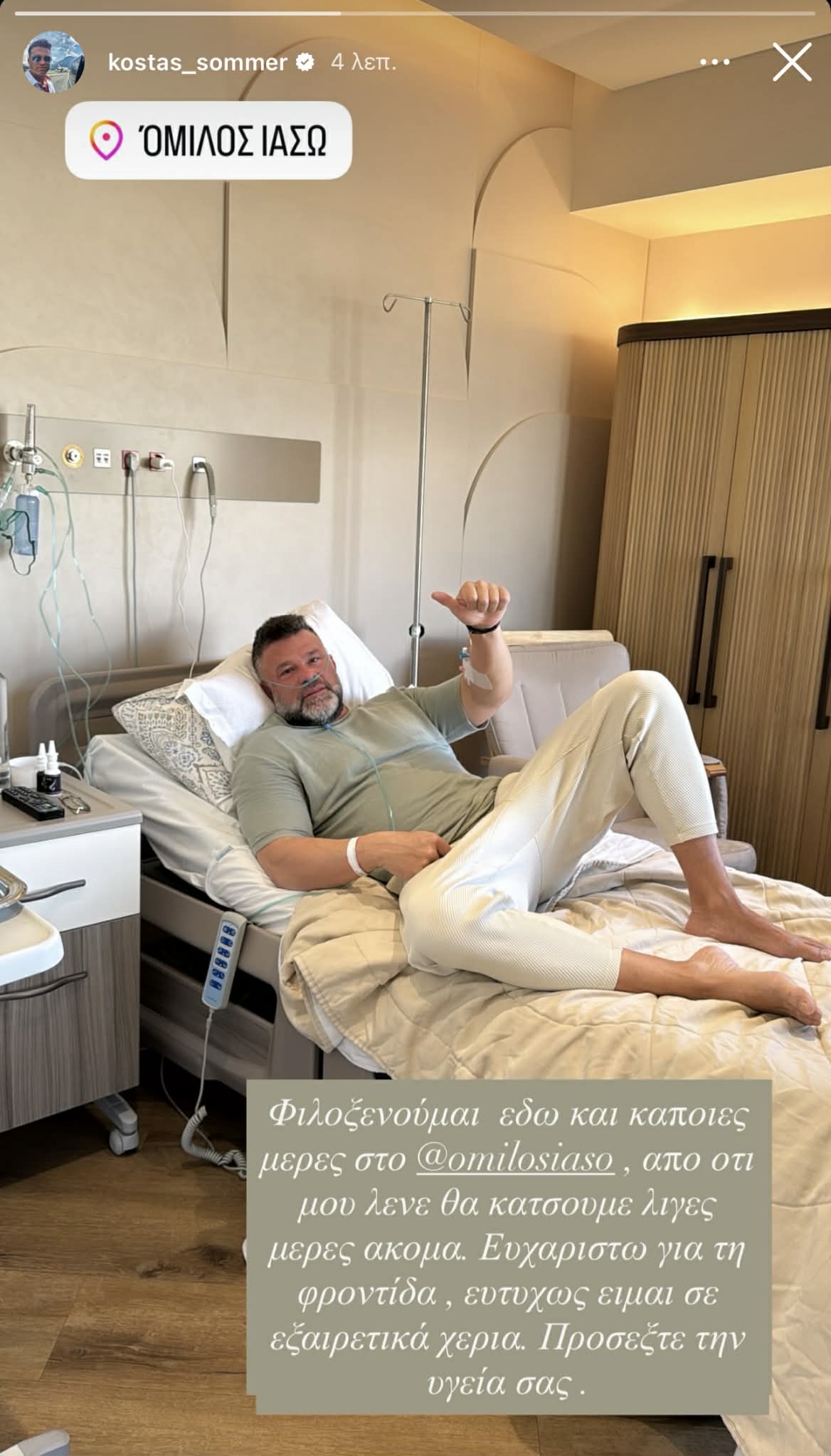 Συγκεκριμένα, ανέφερε τα εξής στο story του: «Φιλοξενούμαι, εδώ και λίγες μέρες. Και από ότι μου λέει ο γιατρός για λίγες μέρες ακόμα. Ευχαριστώ πολύ για όλα, να προσέχετε την υγεία σας».