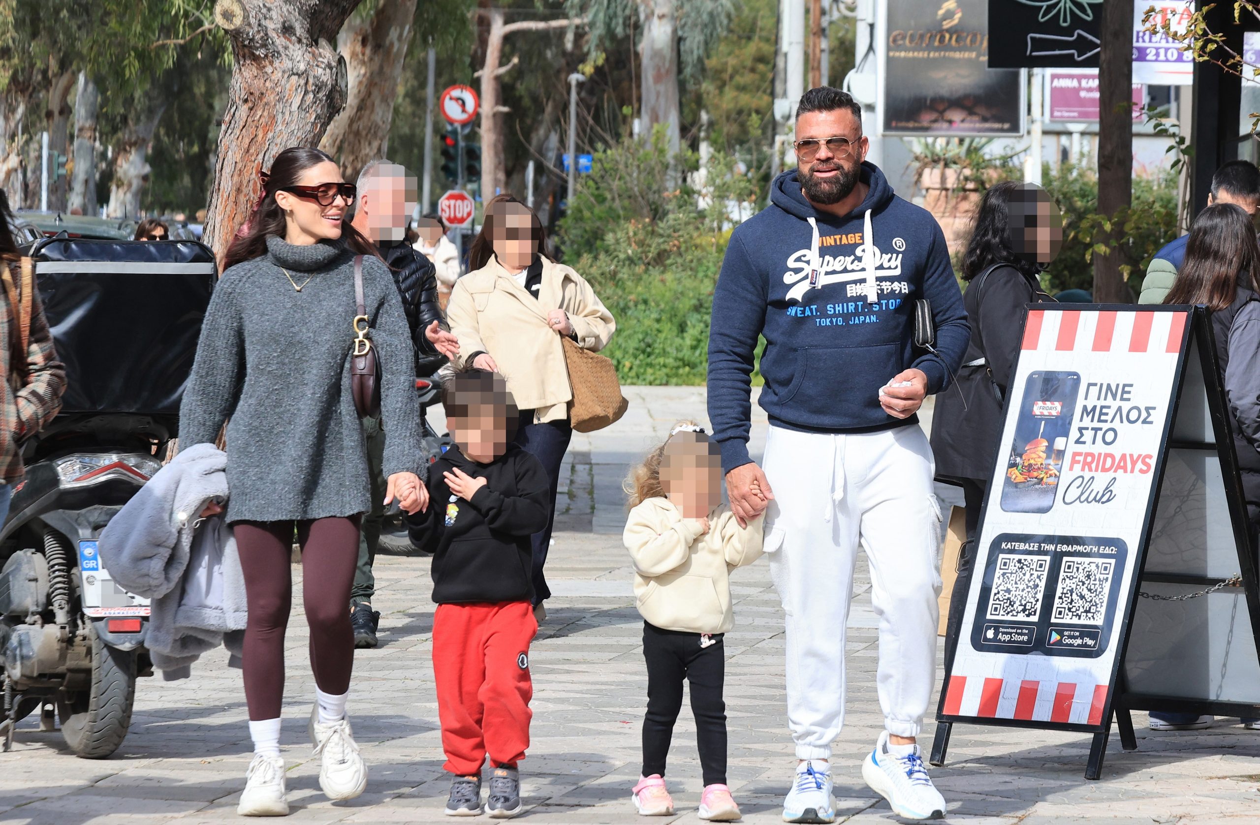 Το ζευγάρι απαθανατίστηκε να περπατά στους δρόμους της περιοχής μαζί με τον μικρό Ιάσονα και τη Σιμόνη, σε στιγμές καθημερινότητας, μακριά από επαγγελματικές υποχρεώσεις.