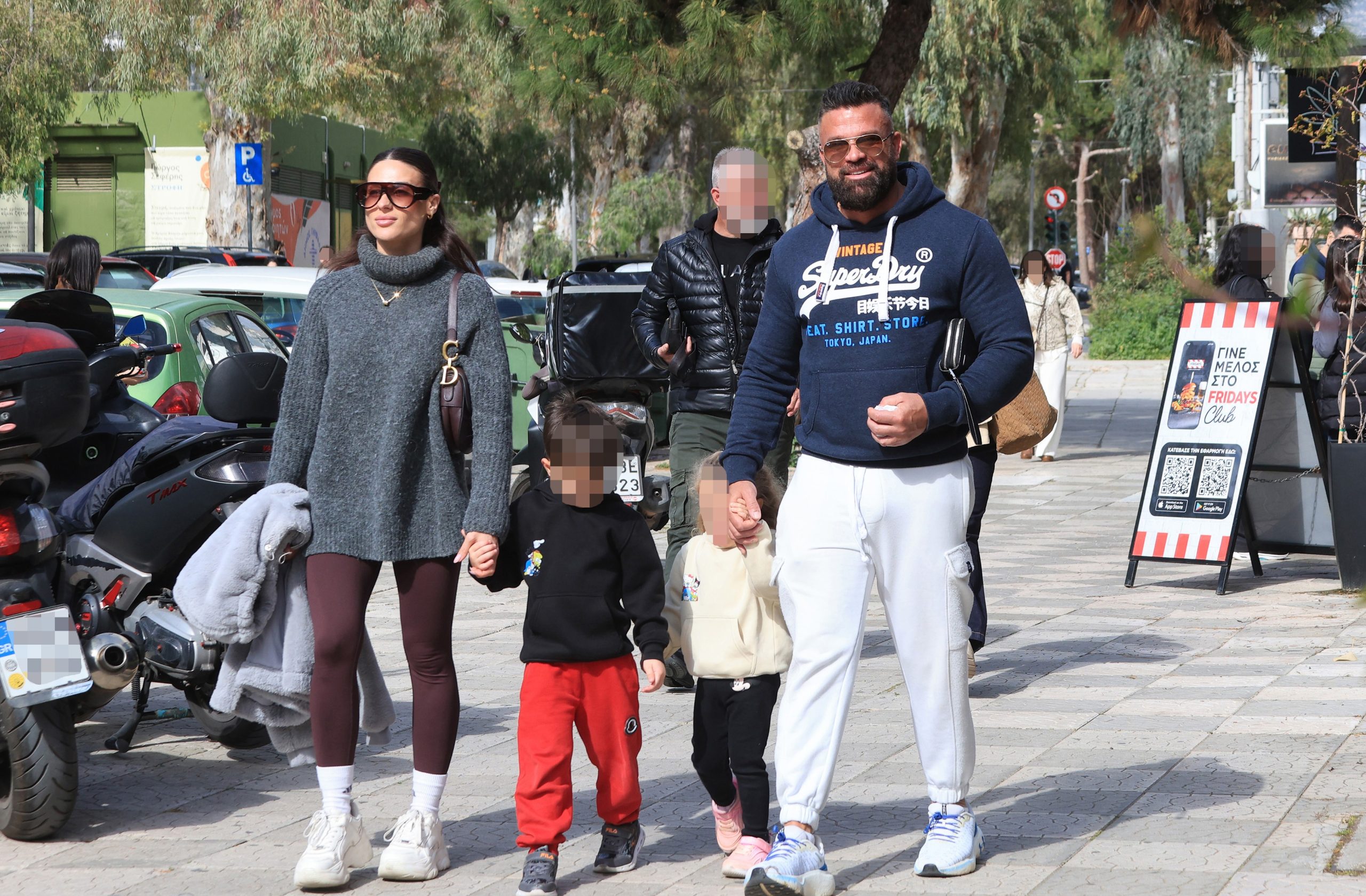 Οι εικόνες αποτυπώνουν μια τρυφερή πλευρά της καθημερινότητάς τους, με τον Κώστα Σόμμερ και τη Βαλεντίνη Παπαδάκη να μοιράζονται απλές στιγμές με τα παιδιά τους, απολαμβάνοντας τον περίπατό τους στη Γλυφάδα.