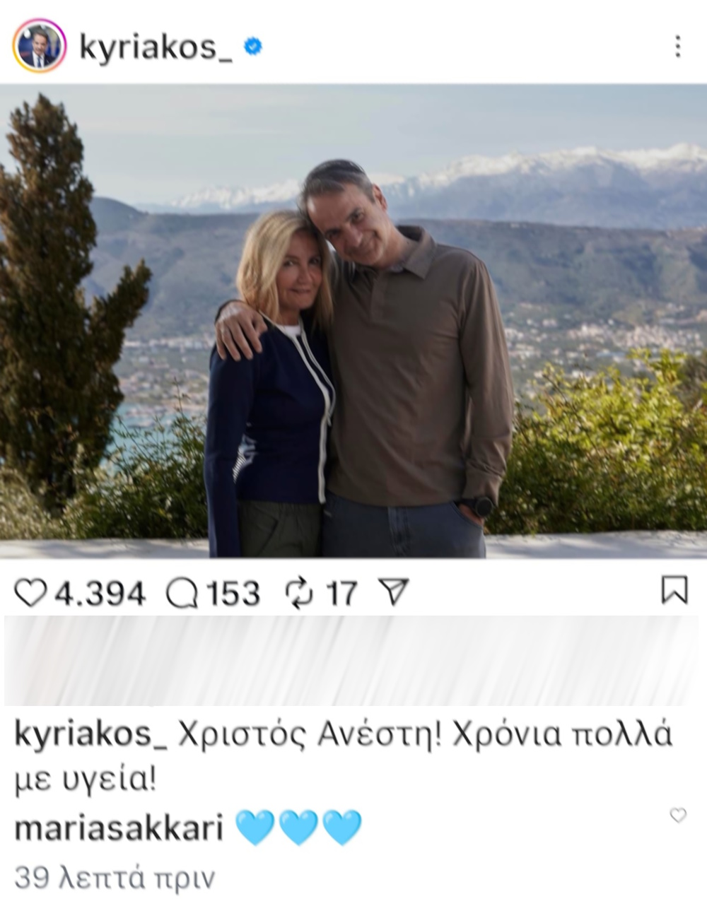 Ο Κυριάκος Μητσοτάκης φαίνεται να κρατά αγκαλιά της σύζυγό του, ενώ στη λεζάντα του στιγμιότυπου, επέλεξε να στείλει τις ευχές του προς τις απανταχού Ελληνίδες και τους Έλληνες, δηλώνοντας: «Χριστός Ανέστη! Χρόνια πολλά με υγεία!».