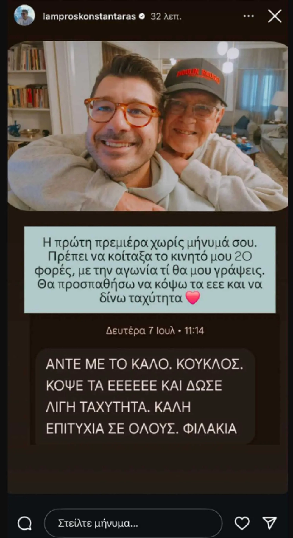 Στην ίδια ανάρτηση, μοιράστηκε και το μήνυμα που του είχε στείλει ο πατέρας του στην καλοκαιρινή πρεμιέρα: «Άντε με το καλό. Κούκλος. Κόψε τα “εεεε” και δώσε λίγη ταχύτητα. Καλή επιτυχία σε όλους. Φιλάκια».