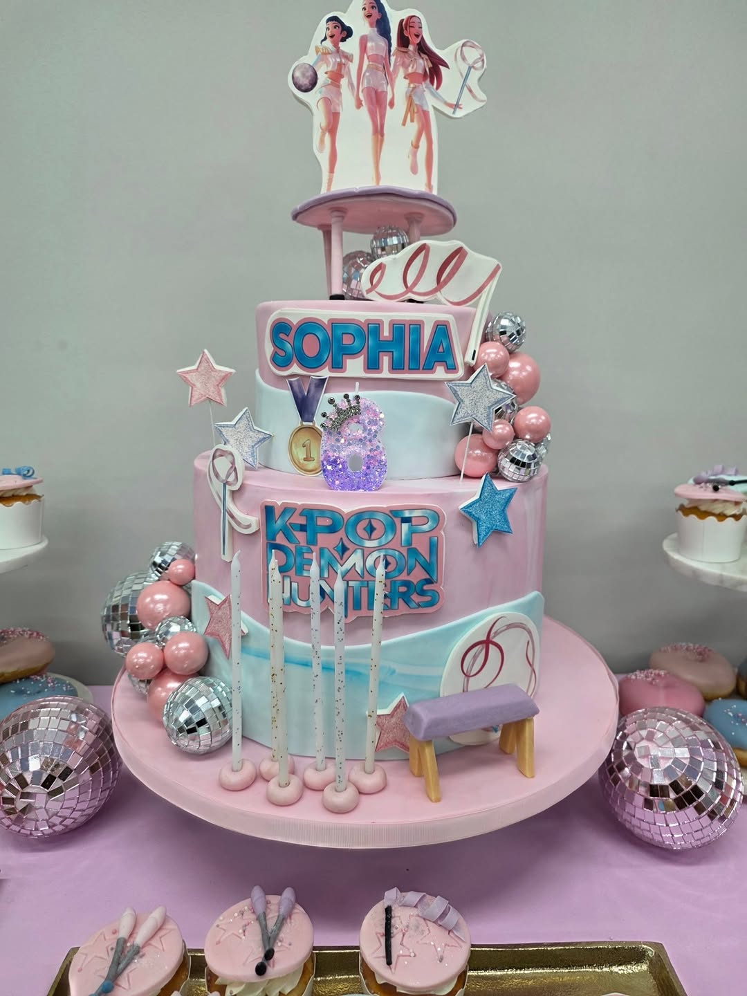 Ιδιαίτερη εντύπωση κλέβει η θεματική τούρτα, πολλών επιπέδων, σε αποχρώσεις του ροζ και του λιλά, με το όνομα Sophia στο κέντρο, διακοσμημένη με αστέρια, μετάλλια, μικρά όργανα γυμναστικής και τον αριθμό 8, που μαρτυρά ότι η μικρή είχε τη χαρά να σβήσει οκτώ κεράκια. Γύρω από την τούρτα, cupcakes και γλυκά στο ίδιο ύφος συμπληρώνουν το birthday table.