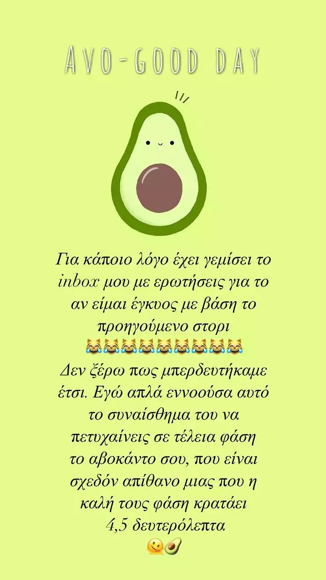 «Για κάποιο λόγο έχει γεμίσει το inbox μου με ερωτήσεις για το αν είμαι έγκυος με βάση το προηγούμενο στορι, Δε ξέρω πως μπερδευτήκαμε έτσι. Εγώ απλά εννοούσα αυτό το συναίσθημα του να πετυχαίνεις σε τέλεια φάση το αβοκάντο σου, που είναι σχεδόν απίθανο, μιας και η καλή τους φάση κρατάει 4,5 δευτερόλεπτα» έγραψε σε ένa story στον προσωπικό της λογαριασμό στο Instagram.
