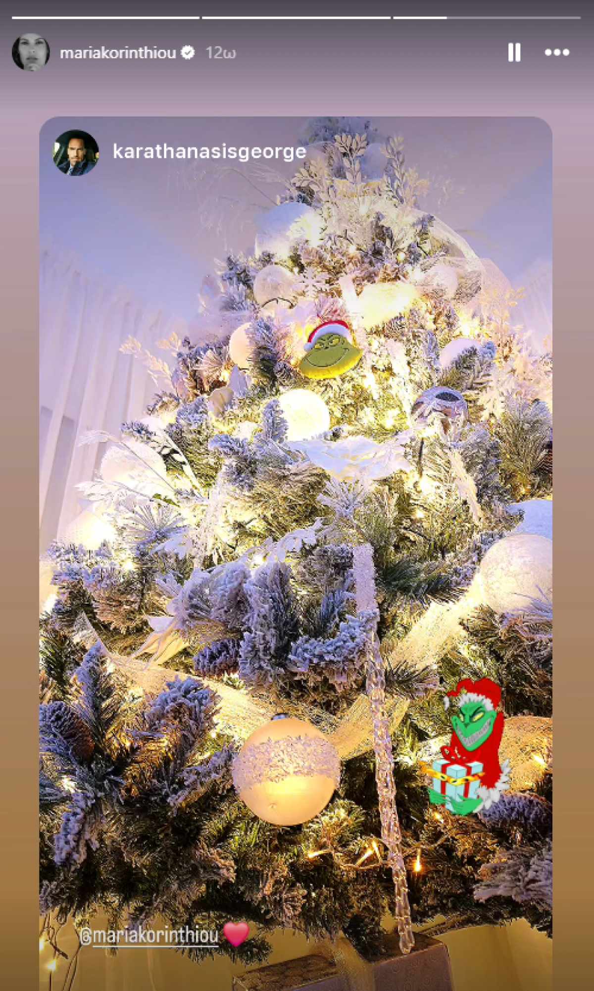 Το βράδυ του Σαββάτου 29 Νοεμβρίου, ο επιχειρηματίας μοιράστηκε στο Instagram ένα στιγμιότυπο από το στολισμένο σπίτι του, το οποίο η ηθοποιός repostαρε αμέσως. Το δέντρο τους, χιονισμένο και ολόλευκο, είναι στολισμένο με λευκές μπάλες και κορδέλες, ενώ στο κέντρο του ξεχωρίζει ένας παιχνιδιάρικος Grinch — μια μικρή πινελιά χιούμορ μέσα στη γιορτινή ατμόσφαιρα.