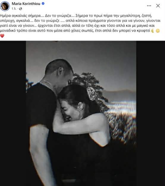 Σήμερα, λοιπόν, Παγκόσμια Ημέρα Αγκαλιάς, η Μαρία Κορινθίου, θέλησε να γράψει ένα τρυφερό μήνυμα, στον αγαπημένο της Γιώργο Καραθανάση. Χαρακτηριστικά η ίδια έγραψε: «Ημέρα αγκαλιάς σήμερα…. Δεν το γνώριζα…. Σήμερα το πρωί πήρα την μεγαλύτερη, ζεστή, υπέροχη, αγκαλιά…. δεν το γνώριζε ….. απλά κάποια πράγματα γίνονται για να γίνουν, γίνονται γιατί είναι να γίνουν… έρχονται έτσι απλά, αλλά εν τέλη όχι και τόσο απλά και με μαγικό και μοναδικό τρόπο είναι αυτό που μέσα από χίλιες σιωπές, έτσι απλά δεν μπορεί να κρυφτεί».