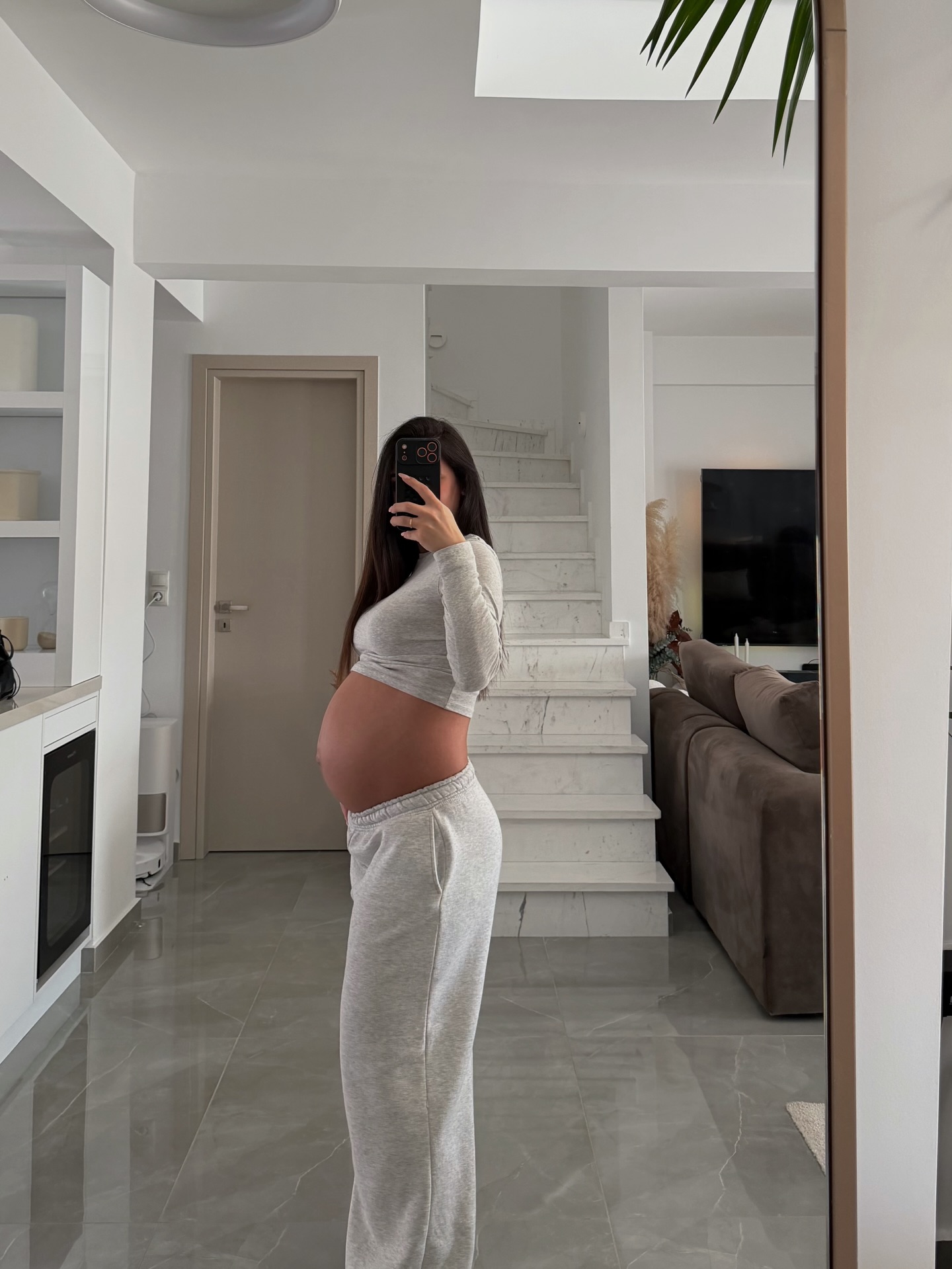 Στην ανάρτηση που έκανε στα social media, πόζαρε στον φακό μέσα από καθρέφτη, φορώντας ένα άνετο γκρι σύνολο και έδειξε την κοιλιά της σε προχωρημένο στάδιο της εγκυμοσύνης της.