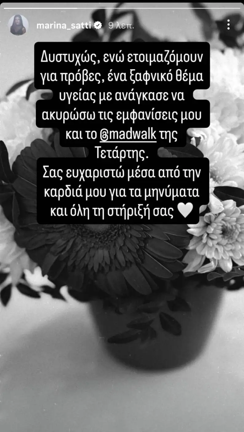 Το απόγευμα της Δευτέρας, η ίδια η Μαρίνα Σάττι μοιράστηκε με τους followers της το πρώτο της μήνυμα για την περιπέτεια υγείας της μέσω Instagram Stories: «Δυστυχώς, ενώ ετοιμαζόμουν για πρόβες, ένα ξαφνικό θέμα υγείας με ανάγκασε να ακυρώσω τις εμφανίσεις μου και το MadWalk της Τετάρτης. Σας ευχαριστώ μέσα από την καρδιά μου για τα μηνύματα και όλη τη στήριξή σας».