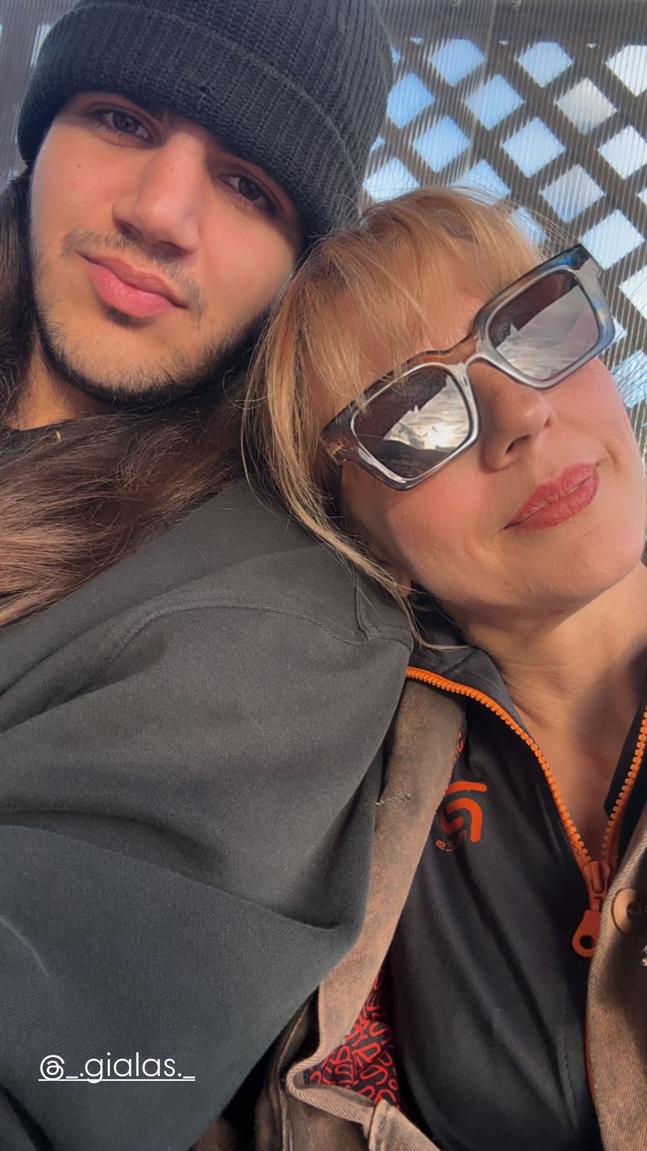 Στη φωτογραφία, η Mατίνα Νικολάου ακουμπά τρυφερά στον ώμο του, με τους δυο τους να χαμογελούν. Ο γιος της φοράει ένα σκούρο σκουφί και casual ρούχα, ενώ εκείνη ολοκληρώνει το look της με statement γυαλιά ηλίου και ένα jacket.