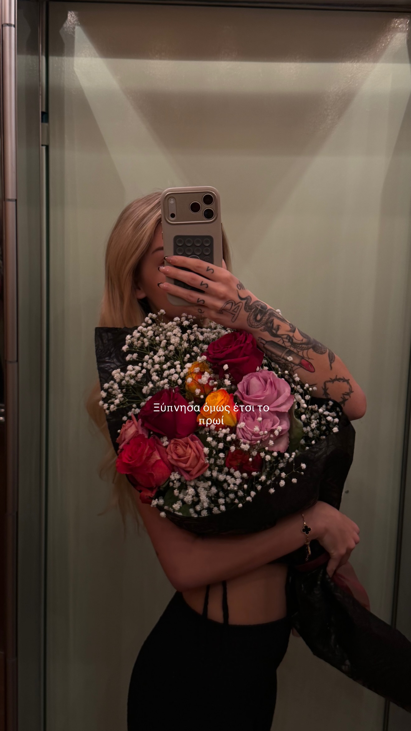 Λίγη ώρα αργότερα, η ίδια επέστρεψε με νέο story, στο οποίο εμφανίστηκε να κρατά μια μεγάλη ανθοδέσμη. Πάνω στη φωτογραφία έγραψε: «Ξύπνησα όμως έστω το πρωί».