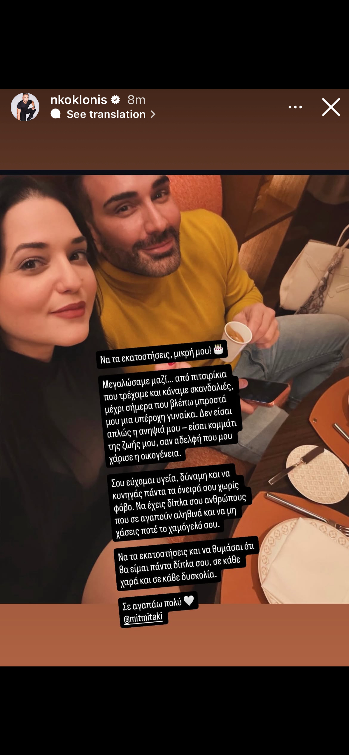 Να τα εκατοστίσεις μικρή μου μεγαλώσαμε μαζί από πιτσιρίκια που τρέχαμε και κάναμε σκανδαλιές μέχρι σήμερα που βλέπω μπροστά μου μια υπέροχη γυναίκα. Δεν είσαι απλώς η ανιψιά μου είσαι κομμάτι της ζωής μου σαν αδελφή που μου χάρισε οικογένεια. Σου εύχομαι υγεία δύναμη και να κυνηγάς πάντα τα όνειρά σου χωρίς φόβο. Να έχεις δίπλα σου ανθρώπους που σε αγαπούν αληθινά και να μη χάσεις ποτέ το χαμόγελό σου. Να τα εκατοστίσεις και να θυμάσαι ότι θα είμαι πάντα δίπλα σου σε κάθε χαρά και σε κάθε δυσκολία. Σε αγαπώ πολύ».