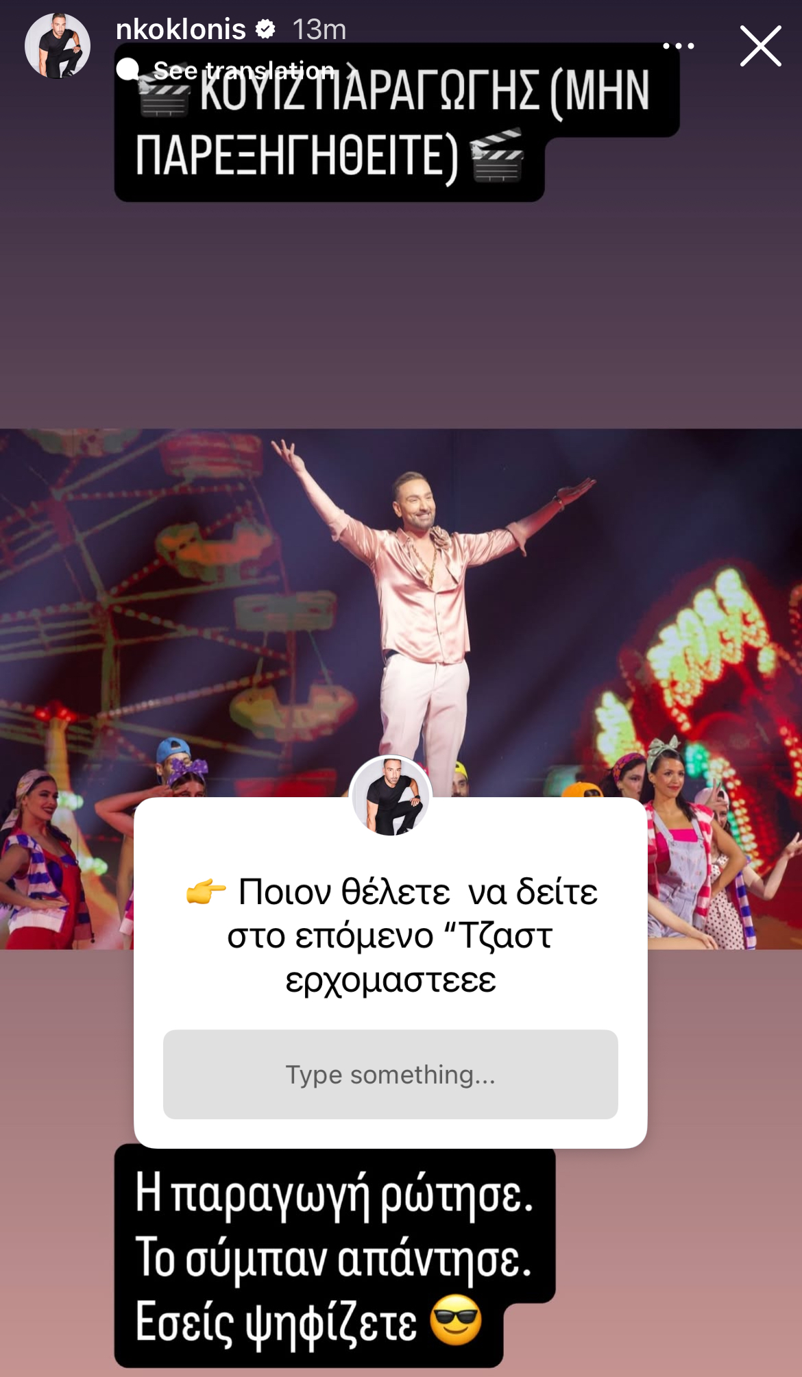 Ωστόσο, δεν έμεινε μόνο στις δηλώσεις. Ο γνωστός παραγωγός φρόντισε να ανεβάσει το ενδιαφέρον του κοινού μέσα από τον προσωπικό του λογαριασμό στο Instagram, όπου δημοσίευσε ένα story με τη μορφή κουίζ. Σε αυτό, ρωτάει τους διαδικτυακούς του φίλους ποιους θα ήθελαν να δουν να συμμετέχουν στη νέα σεζόν του Just the 2 of Us.