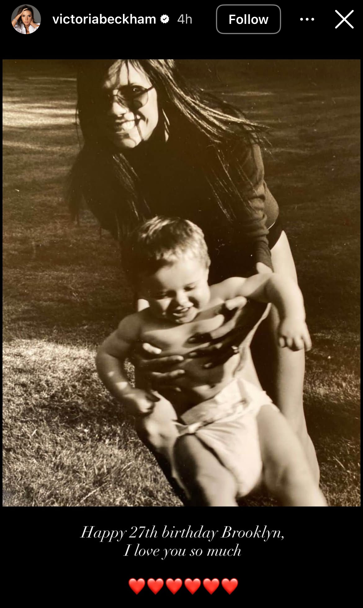 Παρά το τεταμένο κλίμα που, σύμφωνα με δημοσιεύματα, επικρατεί τους τελευταίους μήνες, το πρώην ποδοσφαιρικό αστέρι θέλησε να στείλει δημόσια τις ευχές του μέσα από τα social media. Αρχικά, δημοσίευσε ένα τρυφερό throwback στιγμιότυπο από το παρελθόν, στο οποίο ποζάρει αγκαλιά με τη Victoria και τον μικρό τότε Brooklyn μέσα σε πισίνα. Πάνω στη φωτογραφία έγραψε: «27 σήμερα. Χρόνια πολλά Bust. Σε αγαπάμε», χρησιμοποιώντας το παιδικό παρατσούκλι με το οποίο τον φώναζαν στην οικογένεια.