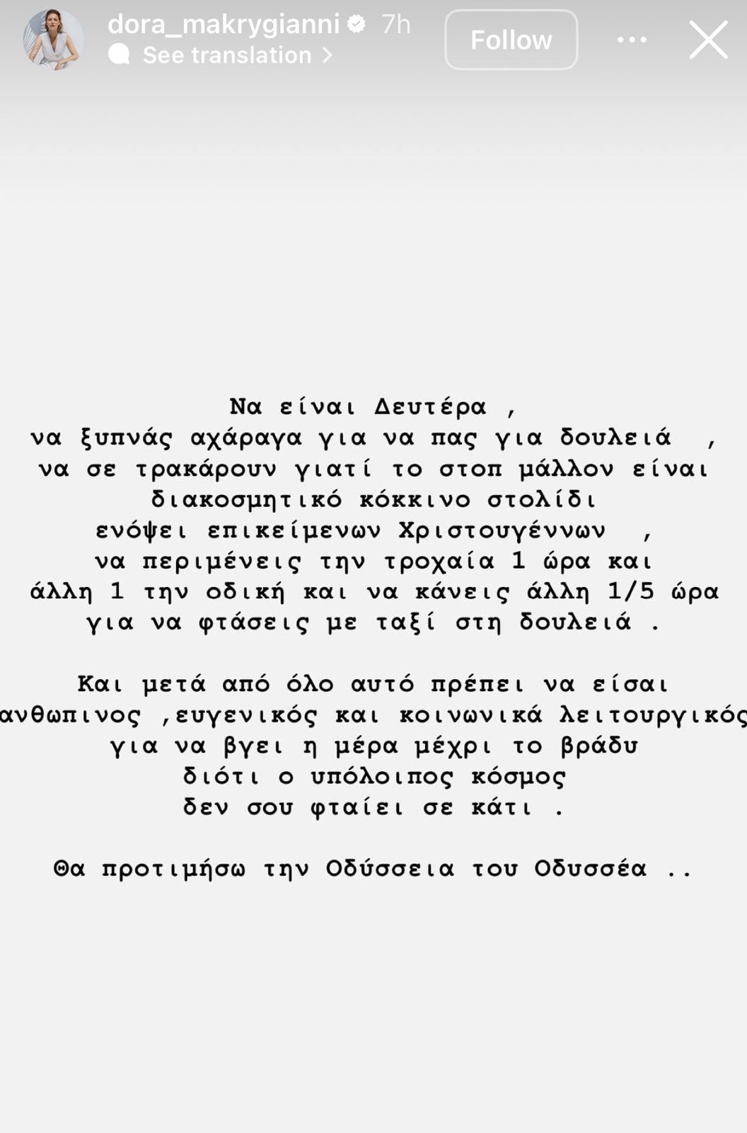 Ευτυχώς, η Ντόρα Μακρυγιάννη δεν τραυματίστηκε, ωστόσο αναγκάστηκε να περιμένει την τροχαία και την οδική βοήθεια, καθυστερώντας για ώρες.