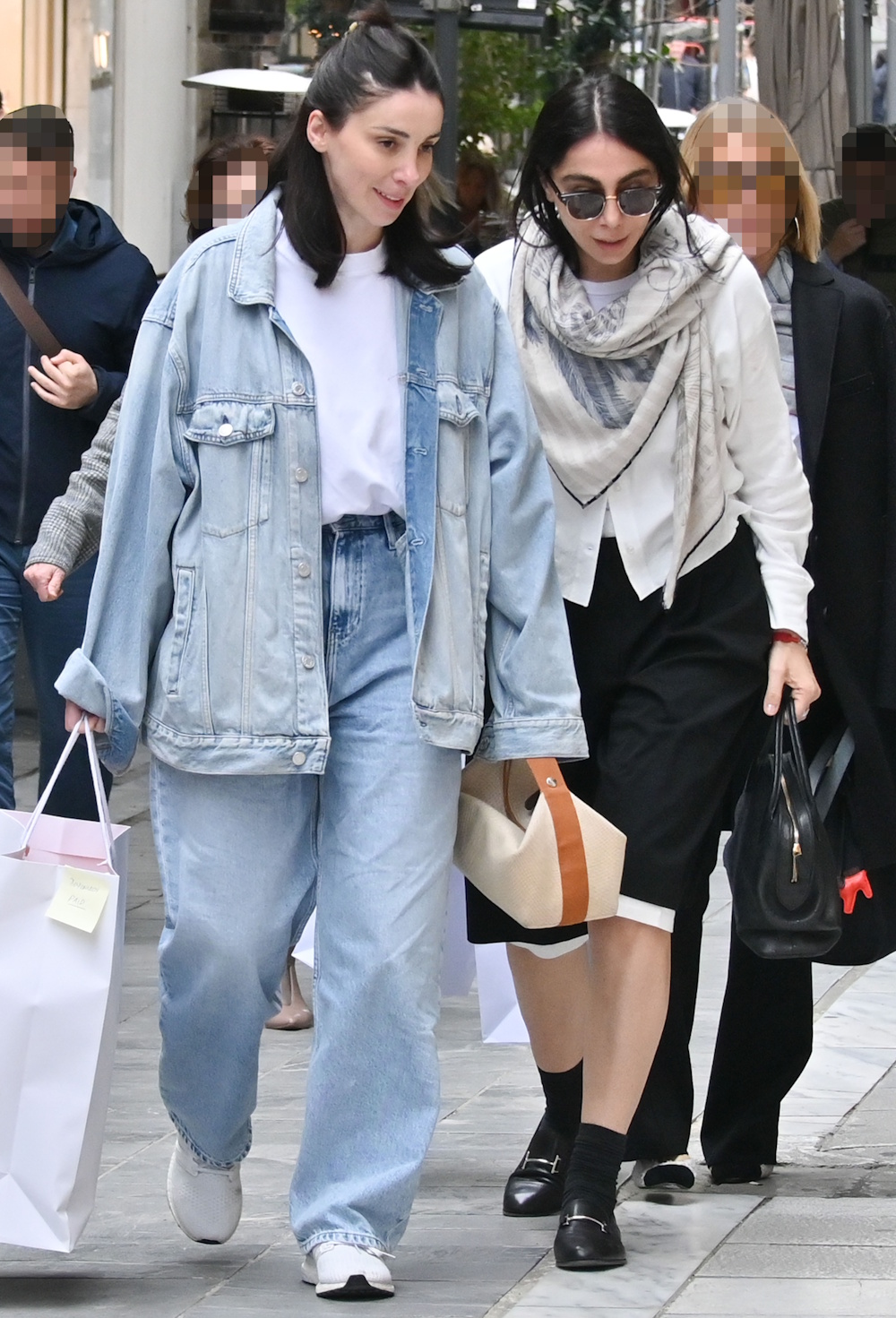 Η Βαλέρια από την άλλη, επέλεξε ένα πιο άνετο και αθλητικό look, με ανοιχτόχρωμο τζιν, το οποίο σέταρε με το ίδιο oversized jacket και λευκό t-shirt. Συμπλήρωσε το λουκ με μια ταμπά τσάντα και λευκά αθλητικά για άνεση στο απαραίτητο περπάτημα που θέλουν τα ψώνια στις αγορές της Αθήνας.