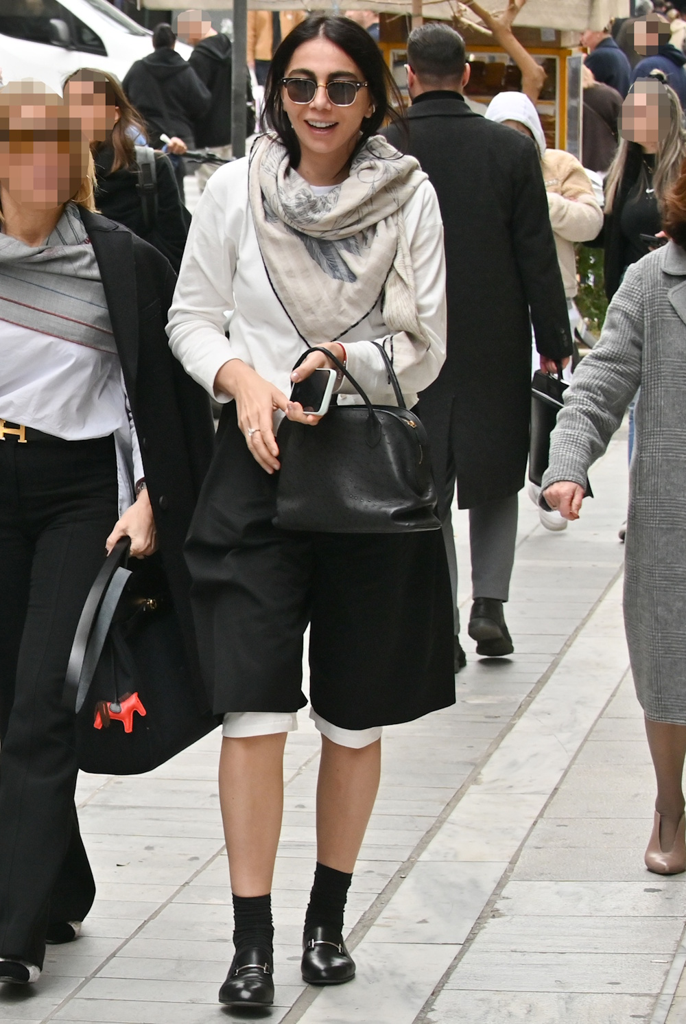 Η Ολυμπία Χοψονίδου, για την εμφάνισή της αυτή, επέλεξε ένα oversized λευκό πουκάμισο και μια φαρδιά μαύρη βερμούδα, η οποία αποτελεί τάση τις τελευταίες σεζόν. Το συνδύασε με ασπρόμαυρο στιλάτο φουλάρι, μαύρη πολυτελή τσάντα, μαύρα γυαλιά και loafers με ψηλές κάλτσες, τα οποία αποτελούν την απόλυτη τάση της φετινής σεζόν. Το outfit της εκφράζει άνεση αλλά και ανεπιτήδευτη κομψότητα.