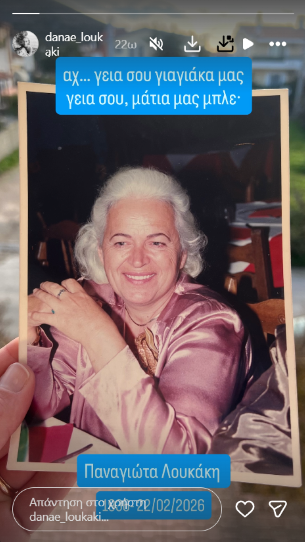 Στην ανάρτηση που δημοσίευσε σε story, συνόδευσε τη φωτογραφία της πολυαγαπημένης της γιαγιάς με λόγια γεμάτα αγάπη και συγκίνηση: «Αχ, γεια σου γιαγιάκα μας, γειά σου, μάτια μας μπλε. Παναγιώτα Λουκάκη, 1936 – 22/2/26».