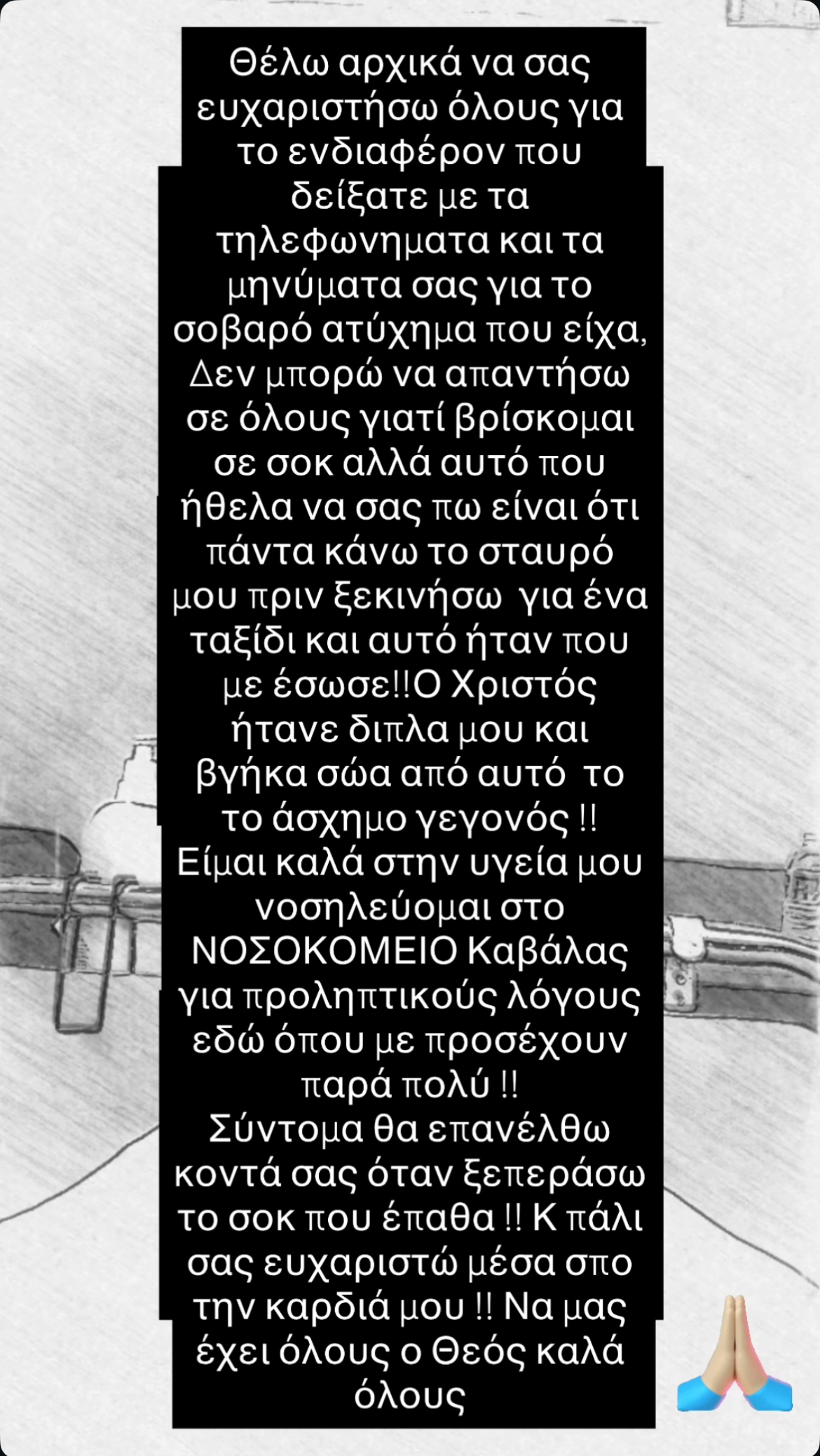 «Θέλω αρχικά να σας ευχαριστήσω όλους για το ενδιαφέρον που δείξατε με τα τηλεφωνήματα και τα μηνύματά σας για το σοβαρό ατύχημα που είχα. Δεν μπορώ να απαντήσω σε όλους γιατί βρίσκομαι σε σοκ αλλά αυτό που ήθελα να σας πω είναι ότι πάντα κάνω το σταυρό μου πριν ξεκινήσω για ένα ταξίδι και αυτό ήταν που με έσωσε! Ο Χριστός ήταν δίπλα μου και βγήκα σώα από αυτό το άσχημο γεγονός! Είμαι καλά στην υγεία μου, νοσηλεύομαι στο Νοσοκομείο Καβάλας για προληπτικούς λόγους εδώ όπου με προσέχουν παρά πολύ! Σύντομα θα επανέλθω κοντά σας όταν ξεπεράσω το σοκ που έπαθα!! Και πάλι σας ευχαριστώ μέσα από την καρδιά μου! Να μας έχει όλους ο Θεός καλά».