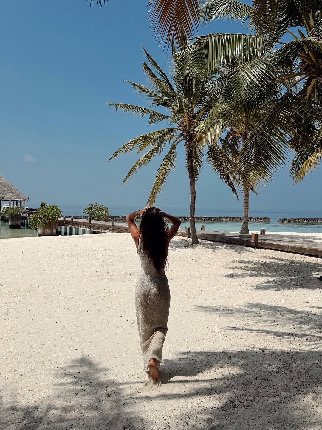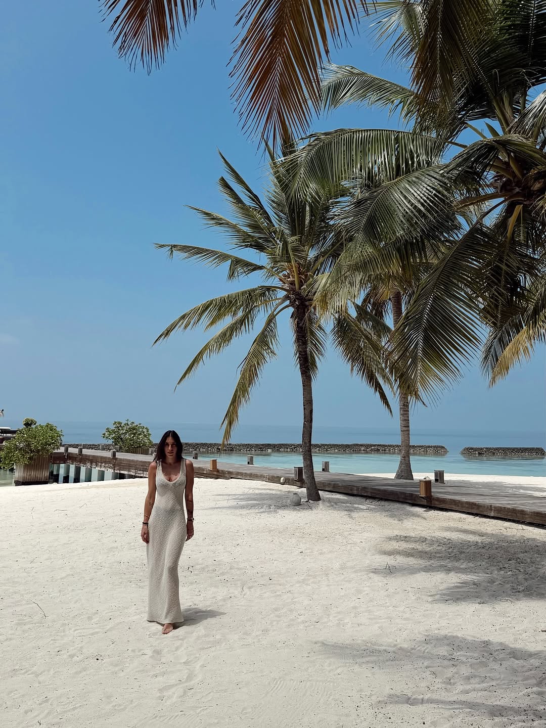 Η Ραφαέλα Ψαρρού δημοσίευσε στον προσωπικό της λογαριασμό φωτογραφίες από το οικογενειακό τους ταξίδι, αποτυπώνοντας το μαγευτικό τοπίο με τα τιρκουάζ νερά, τους φοίνικες και τις ξύλινες προβλήτες που οδηγούν στο απέραντο γαλάζιο. Σε ένα από τα στιγμιότυπα ποζάρει στην παραλία με μακρύ εφαρμοστό φόρεμα σε γήινη απόχρωση, ενώ άλλες εικόνες αναδεικνύουν την ειδυλλιακή ατμόσφαιρα του resort.