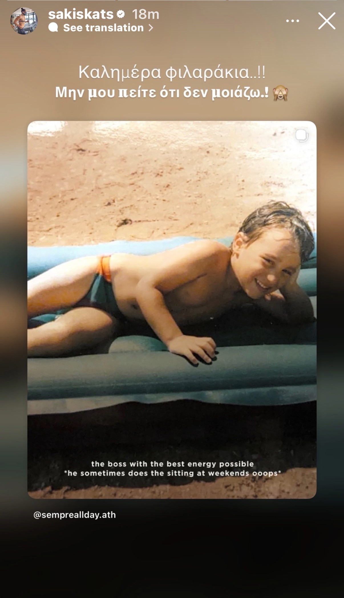 Στο στιγμιότυπο, ο Σάκης Κατσούλης φαίνεται σε μικρή ηλικία, ξαπλωμένος και χαμογελαστός, ενώ συνόδευσε την ανάρτηση με χιουμοριστική διάθεση, γράφοντας: «Καλημέρα φιλαράκια..! Μην μου πείτε ότι δεν μοιάζω!».