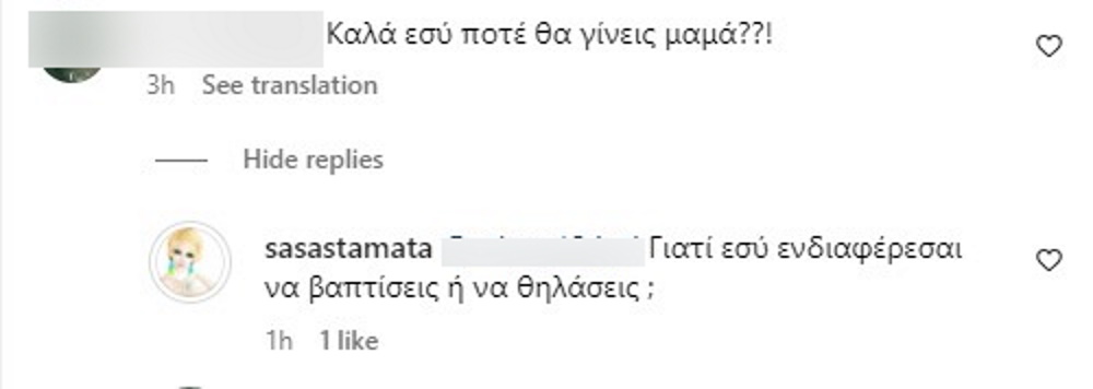Συγκεκριμένα, ο follower την ρώτησε: «Καλά εσύ πότε θα γίνεις μαμά;» και η δημοσιογράφος απάντησε: «Γιατί εσύ ενδιαφέρεσαι να βαπτίσεις ή να θηλάσεις;».