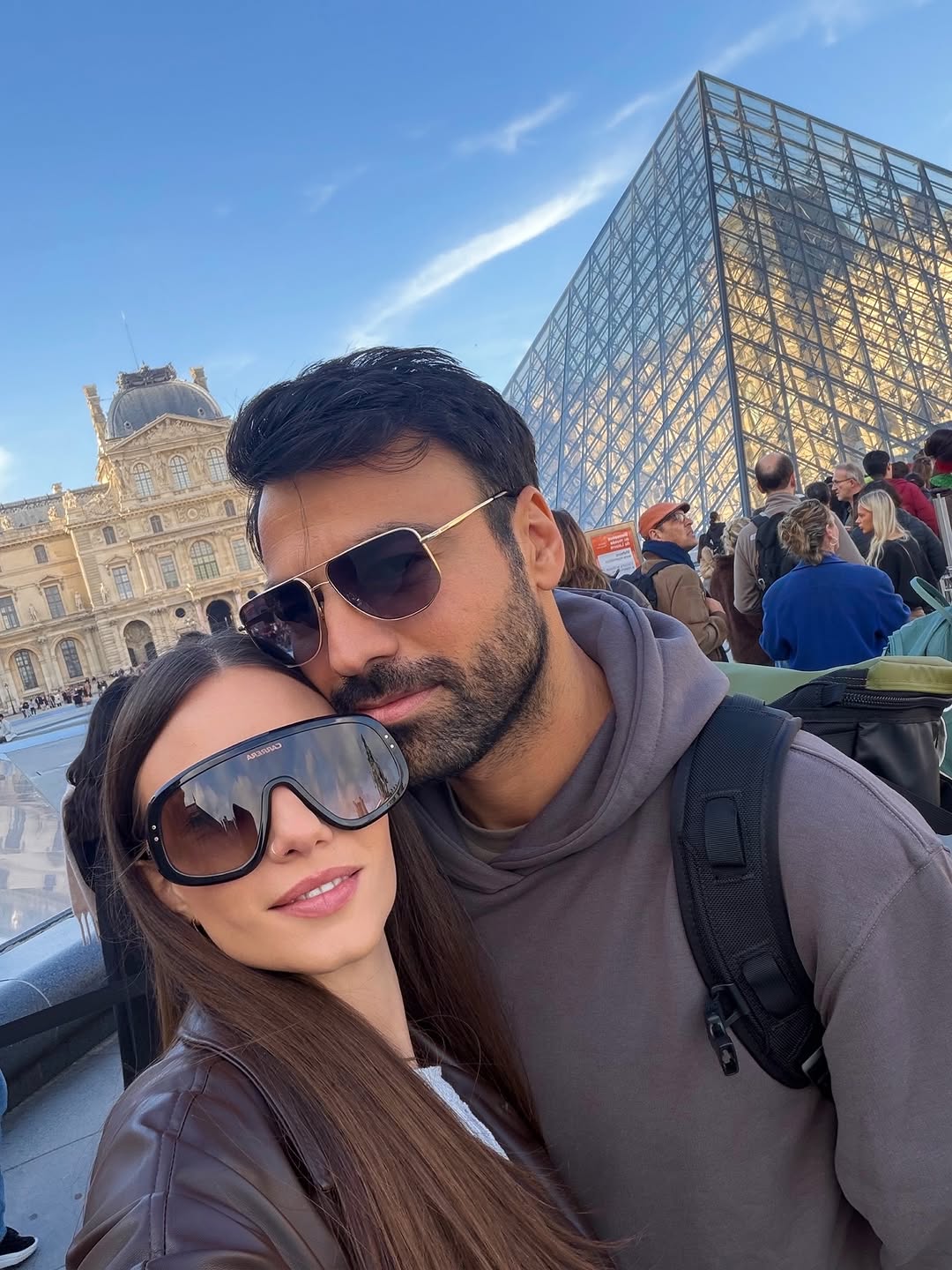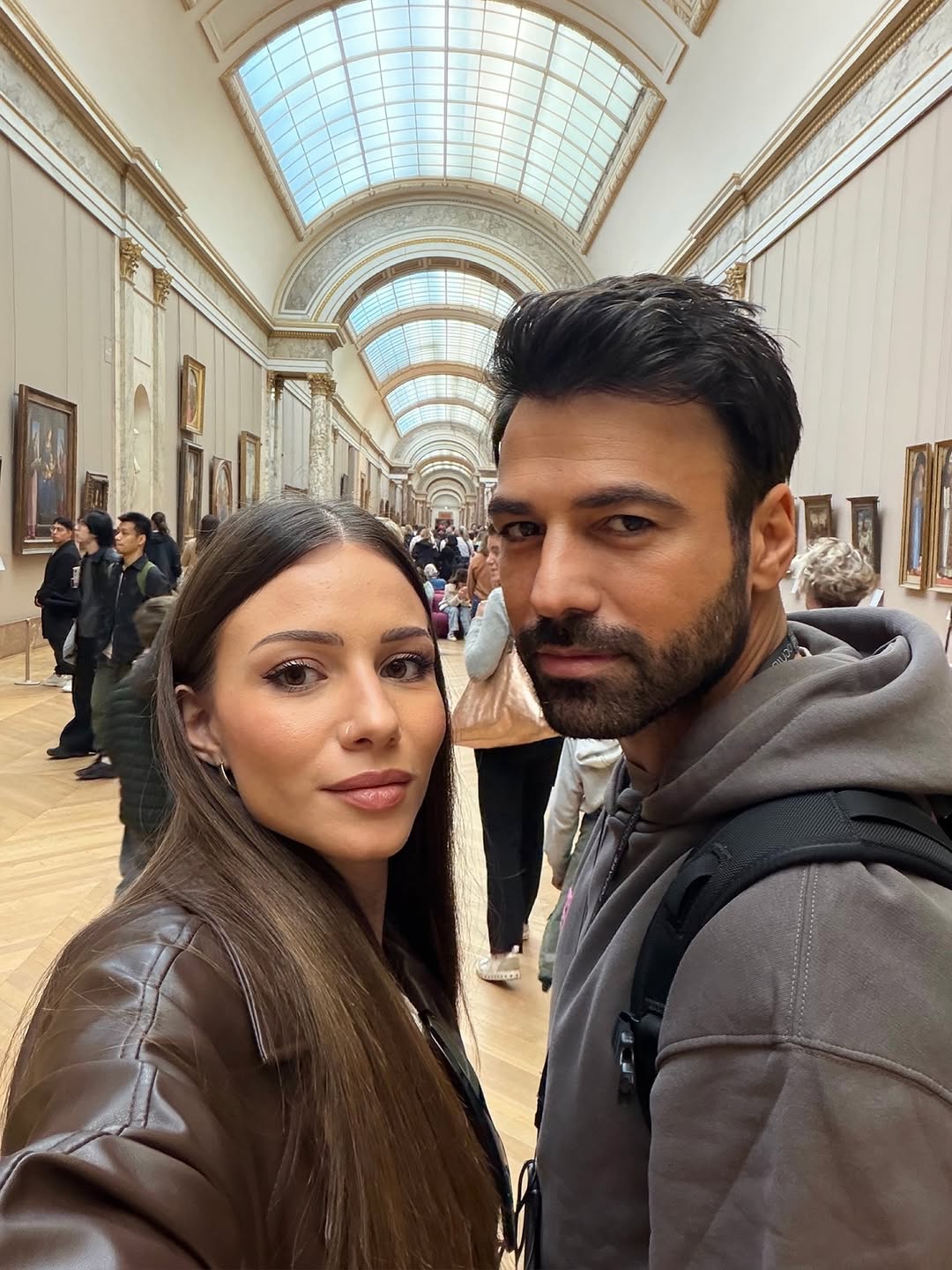 Σε μια από τις φωτογραφίες η Σιμώνη Χριστοδούλου και ο Ανδρέας Γεωργίου ανταλλάσσουν ένα φιλί, απολαμβάνοντας τη βόλτα τους στο Παρίσι. Σε άλλα στιγμιότυπα, το ζευγάρι ποζάρει αγκαλιασμένο έξω από το Λούβρο, μπροστά από τη γυάλινη πυραμίδα, αλλά και μέσα στις αίθουσες του μουσείου, ανάμεσα στους πίνακες.