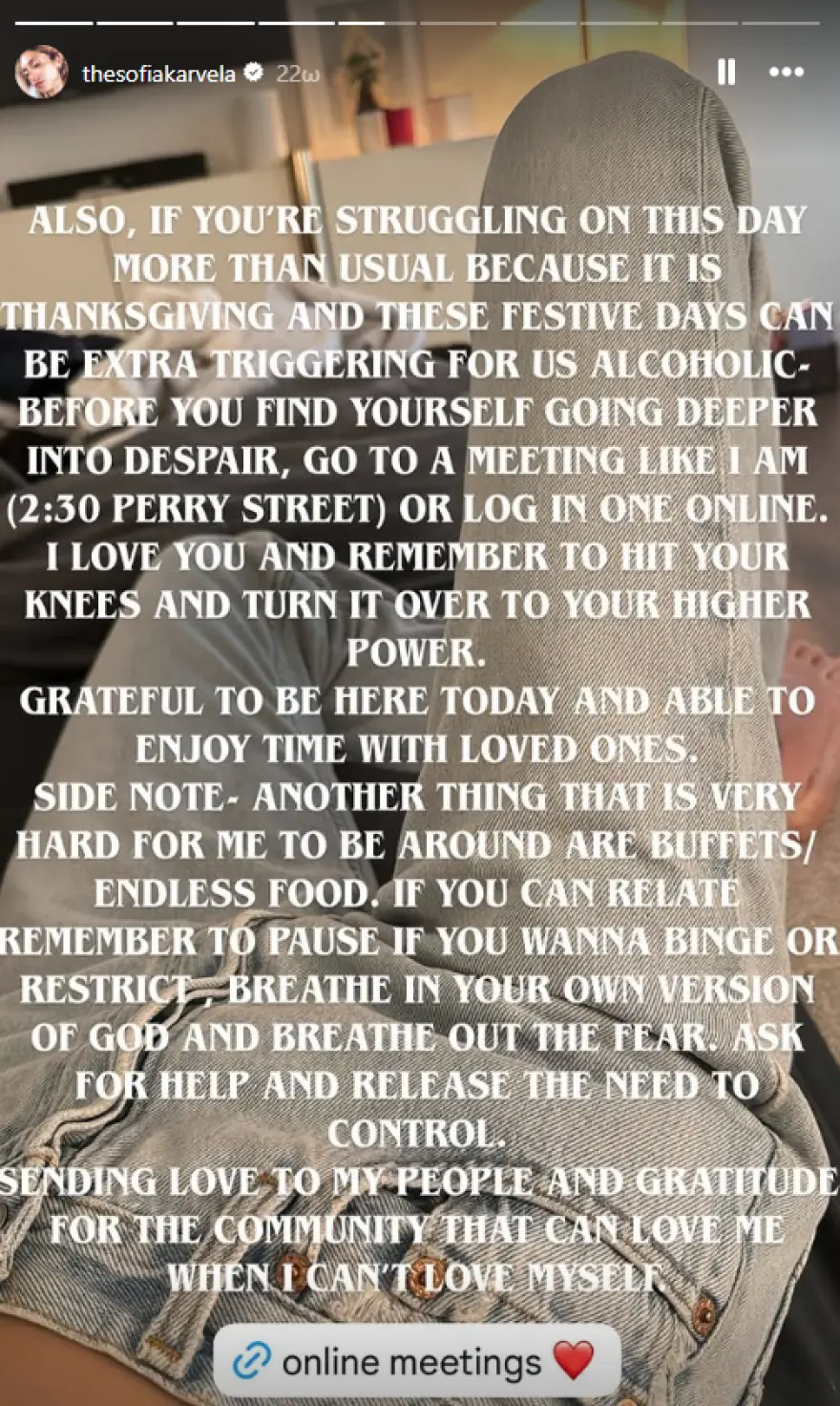 Στην ανάρτησή της στο Instagram έγραψε: «Αν δυσκολεύεσαι αυτήν την ημέρα περισσότερο από το συνηθισμένο επειδή είναι Ημέρα των Ευχαριστιών και αυτές οι γιορτινές μέρες μπορεί να είναι ιδιαίτερα δύσκολες για εμάς τους αλκοολικούς, πριν βρεθείς να βυθίζεσαι ακόμη πιο βαθιά στην απόγνωση, πήγαινε σε μια συνάντηση όπως πηγαίνω κι εγώ ή μπες σε μία διαδικτυακά».