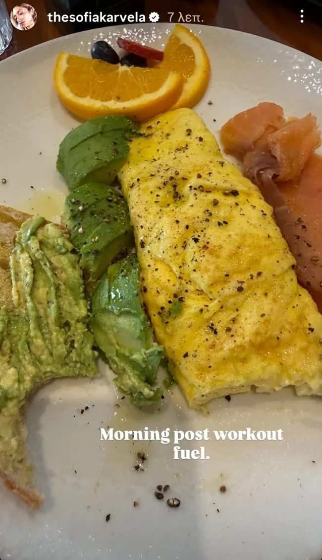 Πρόσφατα, η Σοφία Καρβέλα ανέβασε ένα στιγμιότυπο από το πρωινό που απόλαυσε αμέσως μετά την προπόνησή της στο γυμναστήριο. Όπως έχει τονίσει πολλές φορές, η άσκηση είναι αναπόσπαστο κομμάτι της καθημερινότητάς της και λειτουργεί για εκείνη όχι μόνο σωματικά, αλλά και πνευματικά. Παράλληλα, δεν διστάζει να μοιράζεται και τις διατροφικές της επιλογές, δίνοντας ιδέες για απλά και θρεπτικά γεύματα.