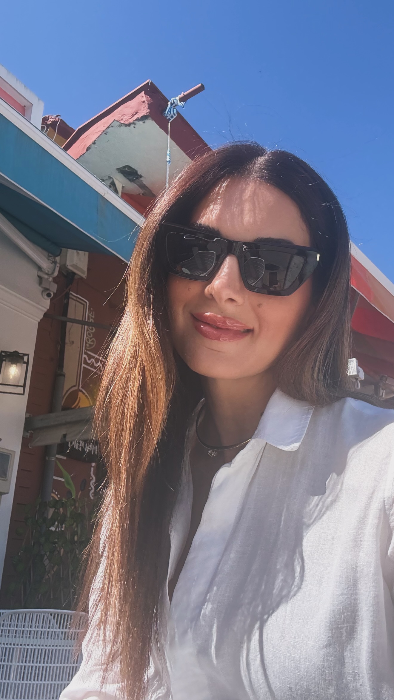 Στα stories που ανέβασε στον προσωπικό της λογαριασμό στο Instagram, η παρουσιάστρια εμφανίζεται αρχικά σε κοντινό στιγμιότυπο, ποζάροντας χαμογελαστή κάτω από τον ήλιο, φορώντας λευκό πουκάμισο και μαύρα γυαλιά ηλίου.