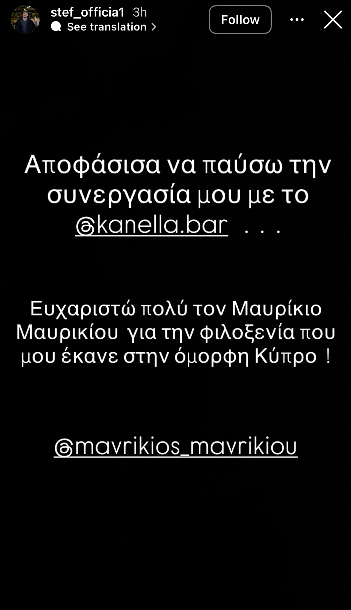 «Αποφάσισα να παύσω τη συνεργασία μου με το kanella.bar. Ευχαριστώ πολύ τον Μαυρίκιο Μαυρικίου για την φιλοξενία που μου έκανε στην όμορφη Κύπρο».