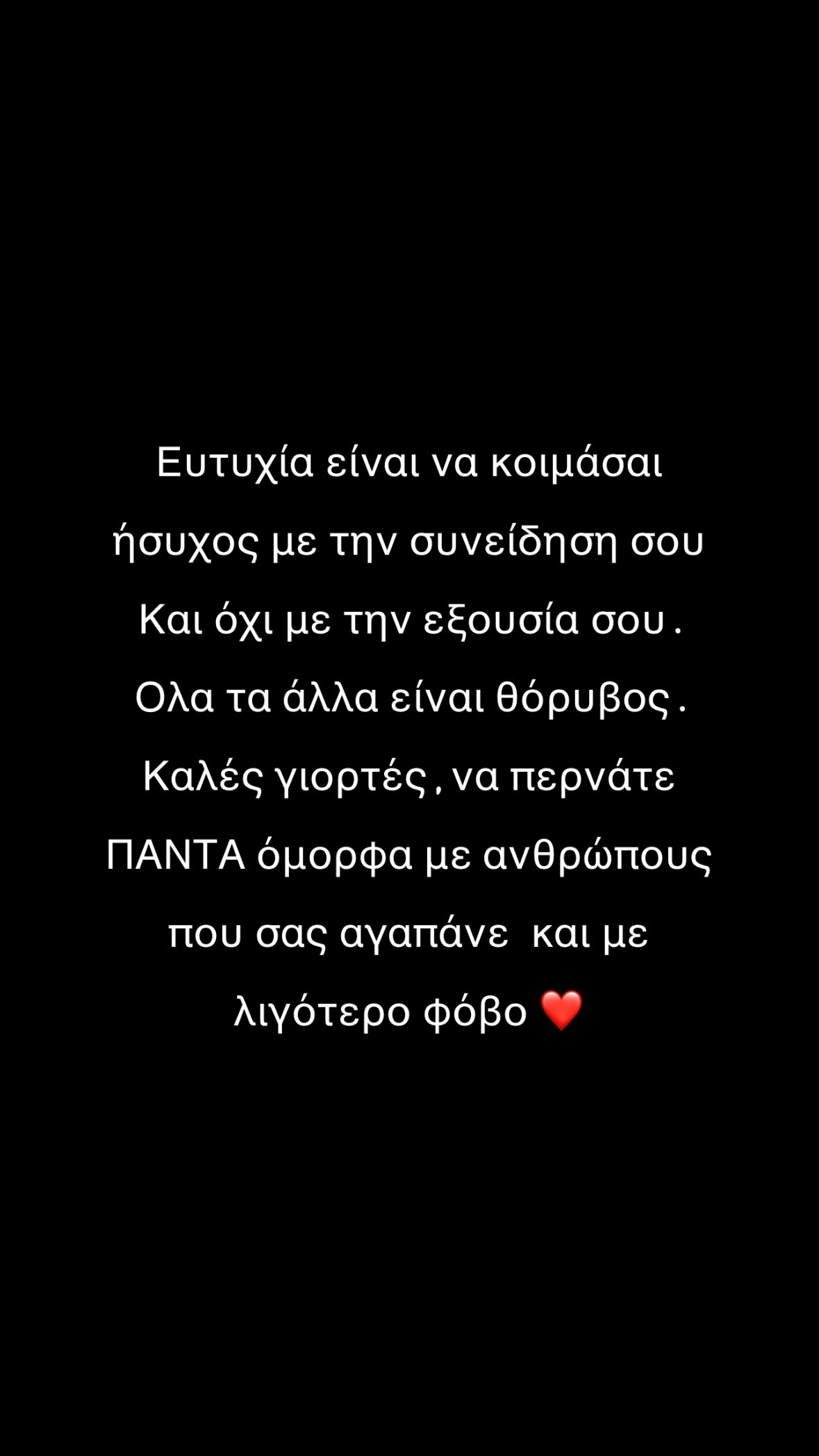 Συγκεκριμένα, σήμερα 26/12, ο καλλιτέχνης, πόσταρε το εξής story στους διαδικτυακούς του φίλους: «Ευτυχία είναι να κοιμάσαι ήσυχος με τη συνείδησή σου και όχι με την εξουσία σου. Όλα τα άλλα είναι θόρυβος».