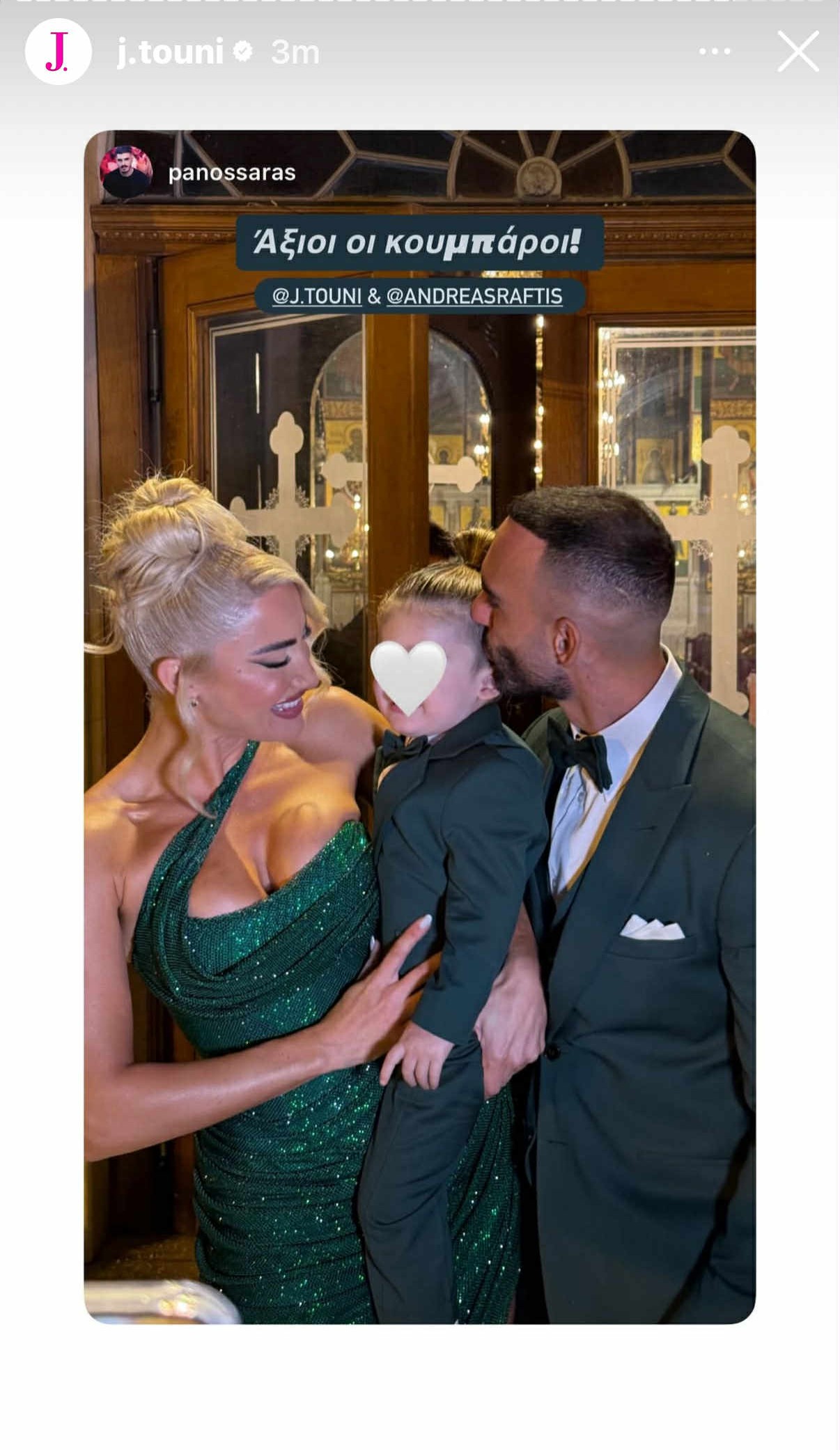 Αμέσως μετά, η Ιωάννα Τούνη ανέβασε και μια γλυκιά φωτογραφία, εκείνη με το πράσινο φόρεμά της μαζί με τον κουμπάρο, Ανδρέα και ανάμεσά τους ο μικρός Πάρης, επίσης ντυμένος στα πράσινα.